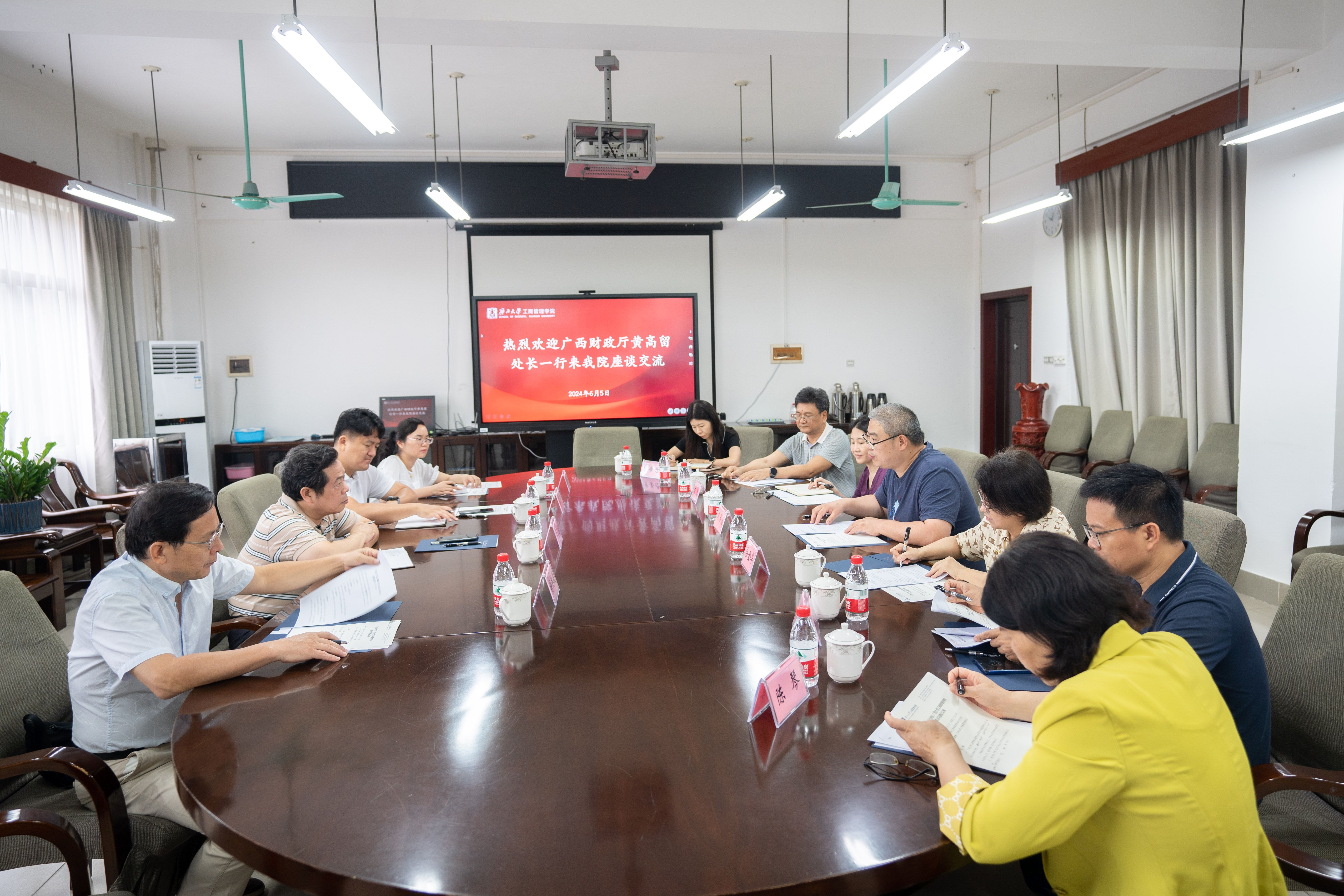 就2024年广西会计学术年会筹备事宜进行座谈。来访期间,校党委常委、副校长宁旭初陪同黄高留秘书长一行参观校史馆,副院长廖东红陪同参观学院,考察本届年会拟用的会场、报告厅情况。