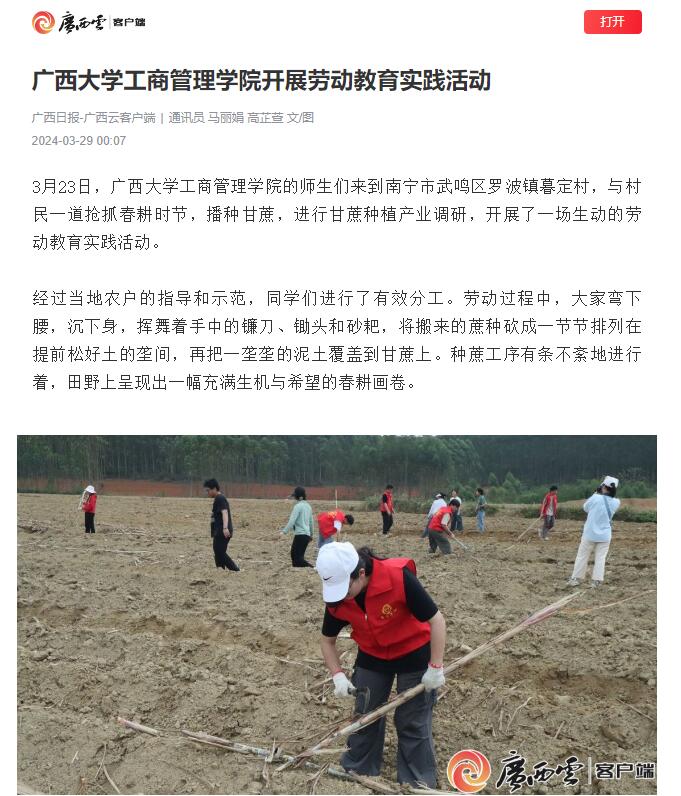 开展劳动教育实践活动》。该报道获广西日报、广西云客户端、南宁日报社、南宁新闻网等主流媒体广泛关注。