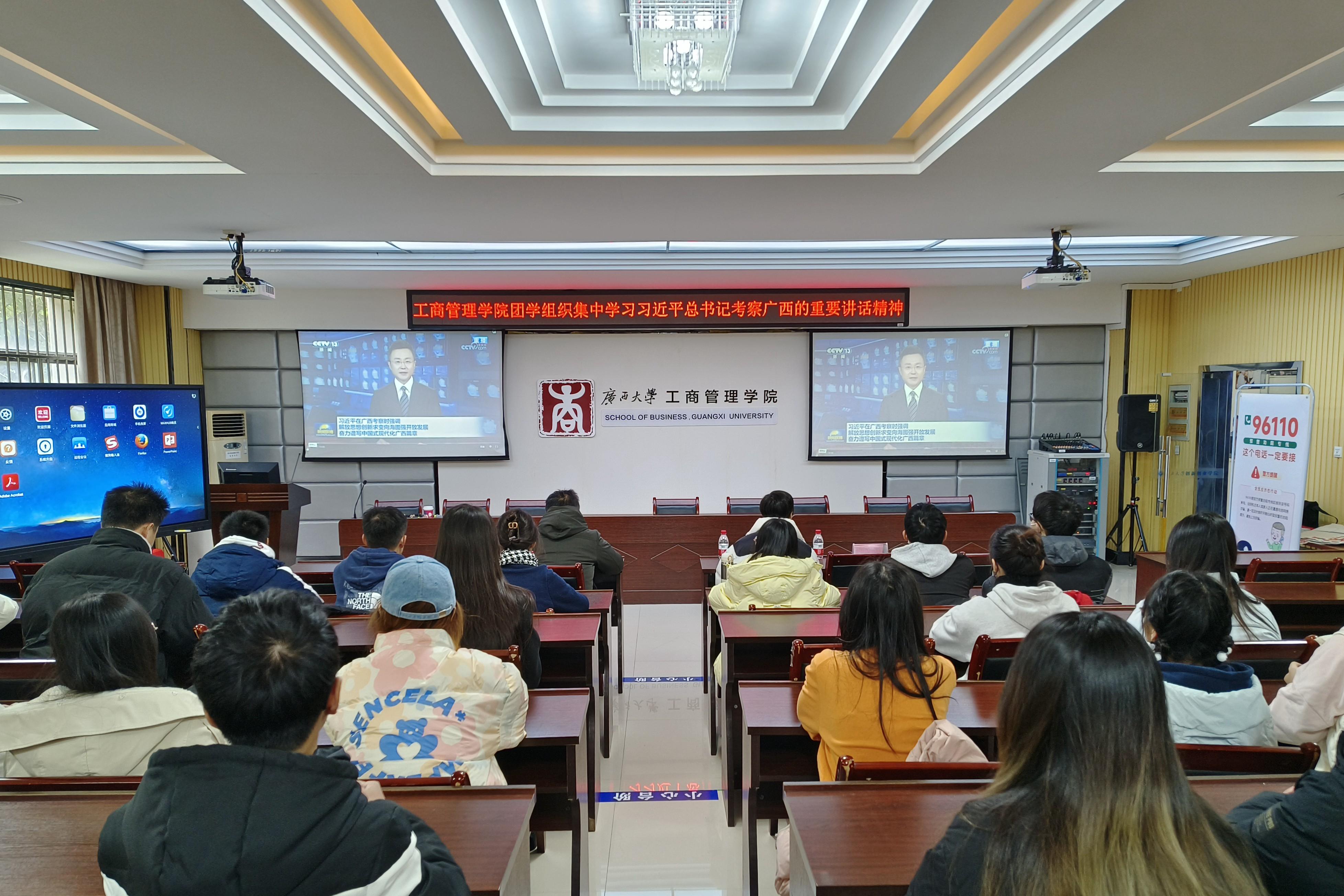 学院团学组织学生干部在学院124报告厅一起观看了习近平总书记视察广西的新闻报道视频,集中学习习近平总书记视察广西的重要讲话精神。