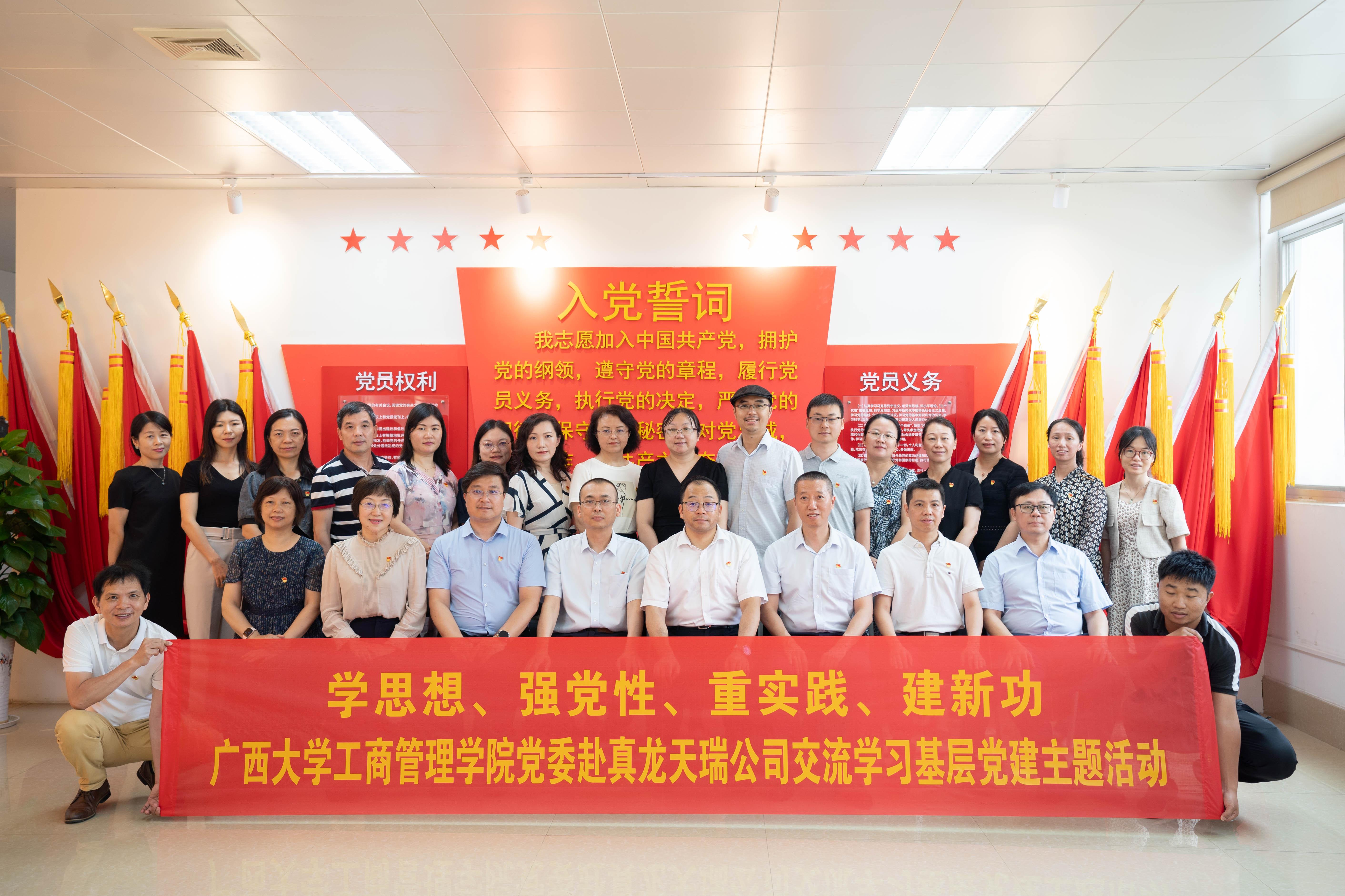 党委书记罗诚率教工行政党支部、教工企管党支部、教工财会党支部和教工旅管党支部的支委和党员代表赴广西真龙天瑞彩印包装有限公司党支部开展学习交流。真龙天瑞党支部隶属中共广西中烟天成投资管理有限责任公司党总支部管辖,努力打造“价值党建”品牌,推进党建与业务深度融合,是南宁高新区两新组织党建示范点。党委副书记黄晋、副院长廖东红、组织员黄照温参加了活动。活动由广西中烟天成投资管理有限责任公司(以下简称“天成投资”)董事长龙毅主持。