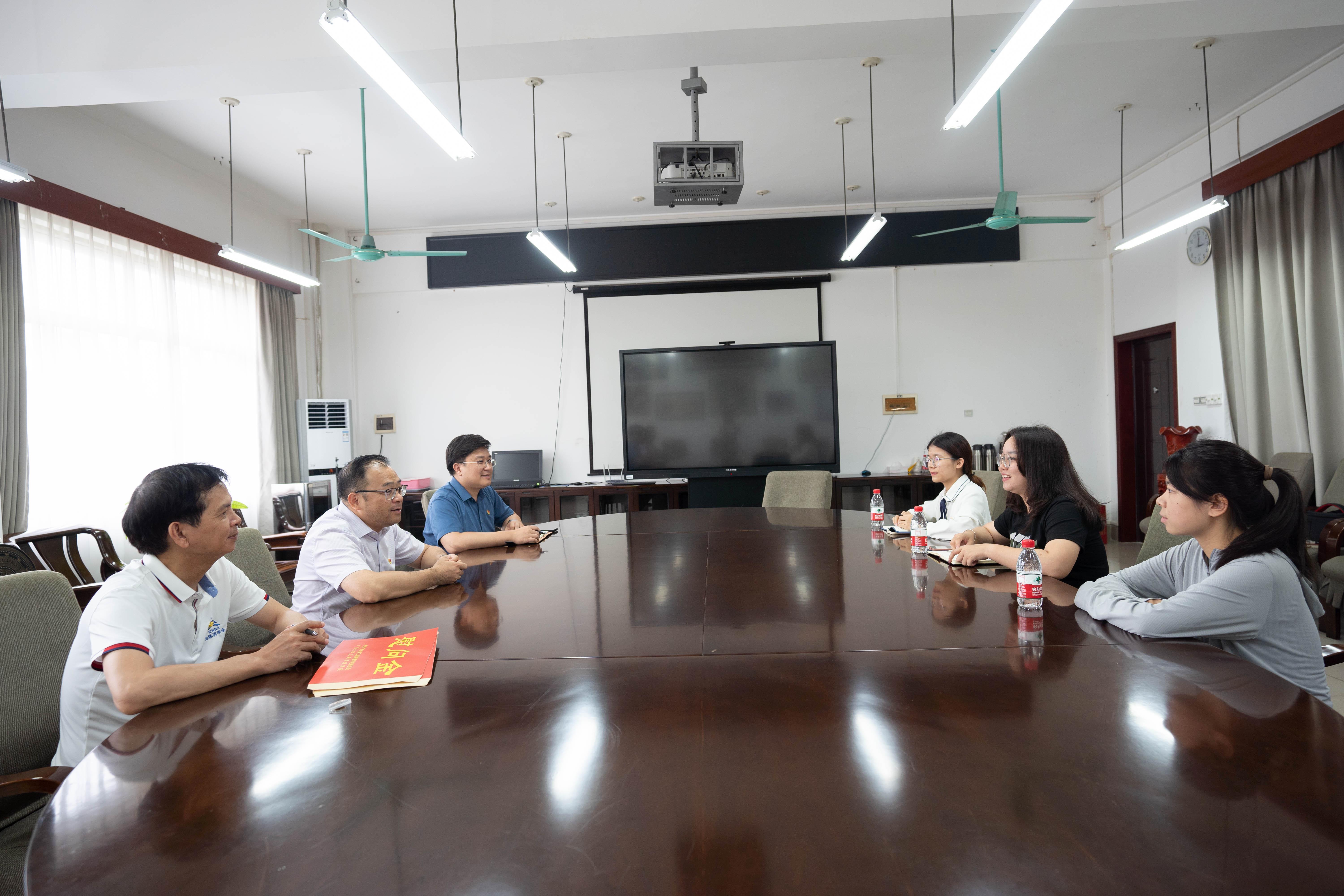 在学院420会议室,院党委书记罗诚,院党委副书记、院长朱帮助,副院长廖东红与老王磁力