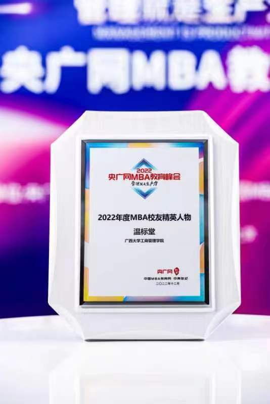 校友温标堂肩负责任担当,富有激情热血,在时代发展中追波逐浪,在社会主义事业建设中大放异彩,荣获“2022年度MBA校友精英人物”荣誉。