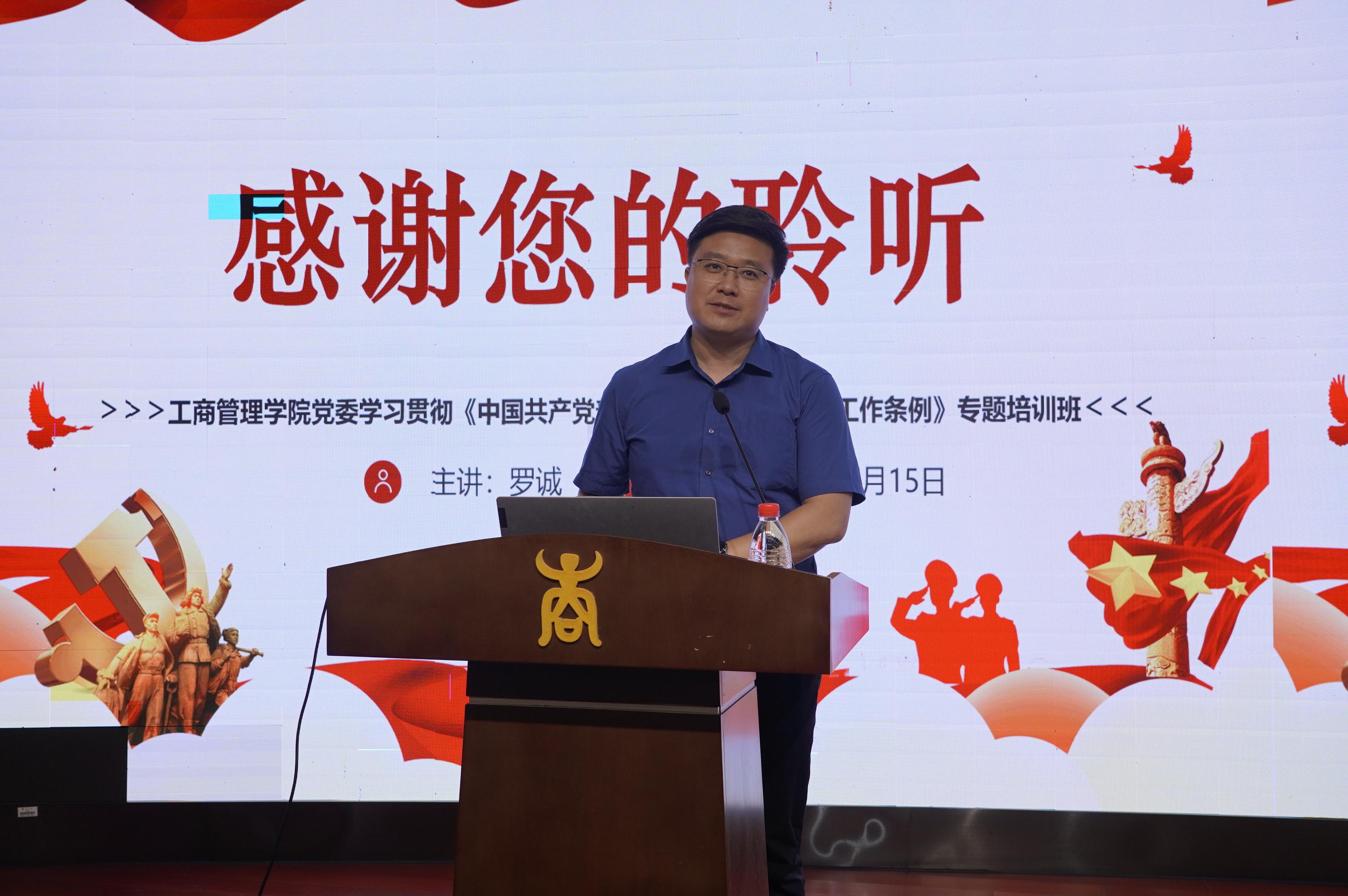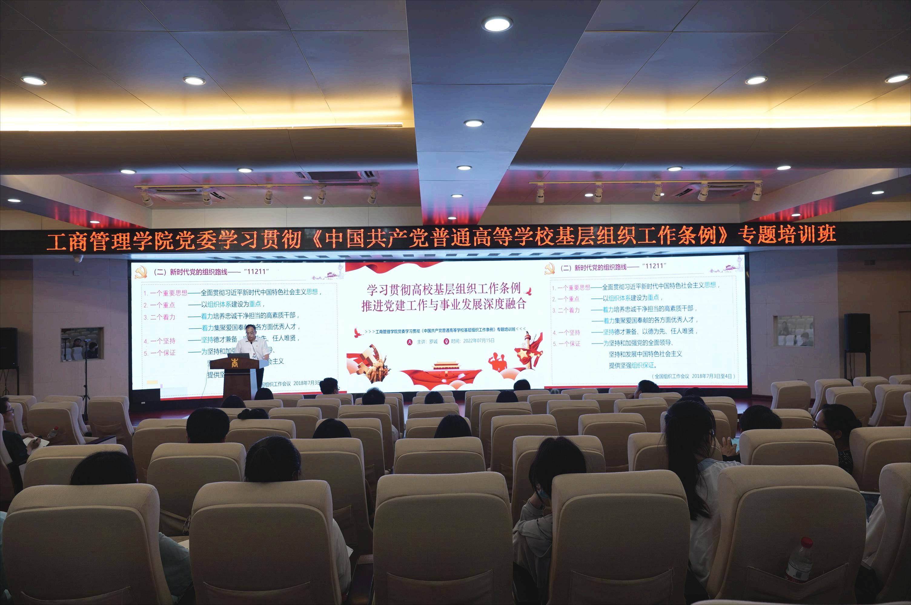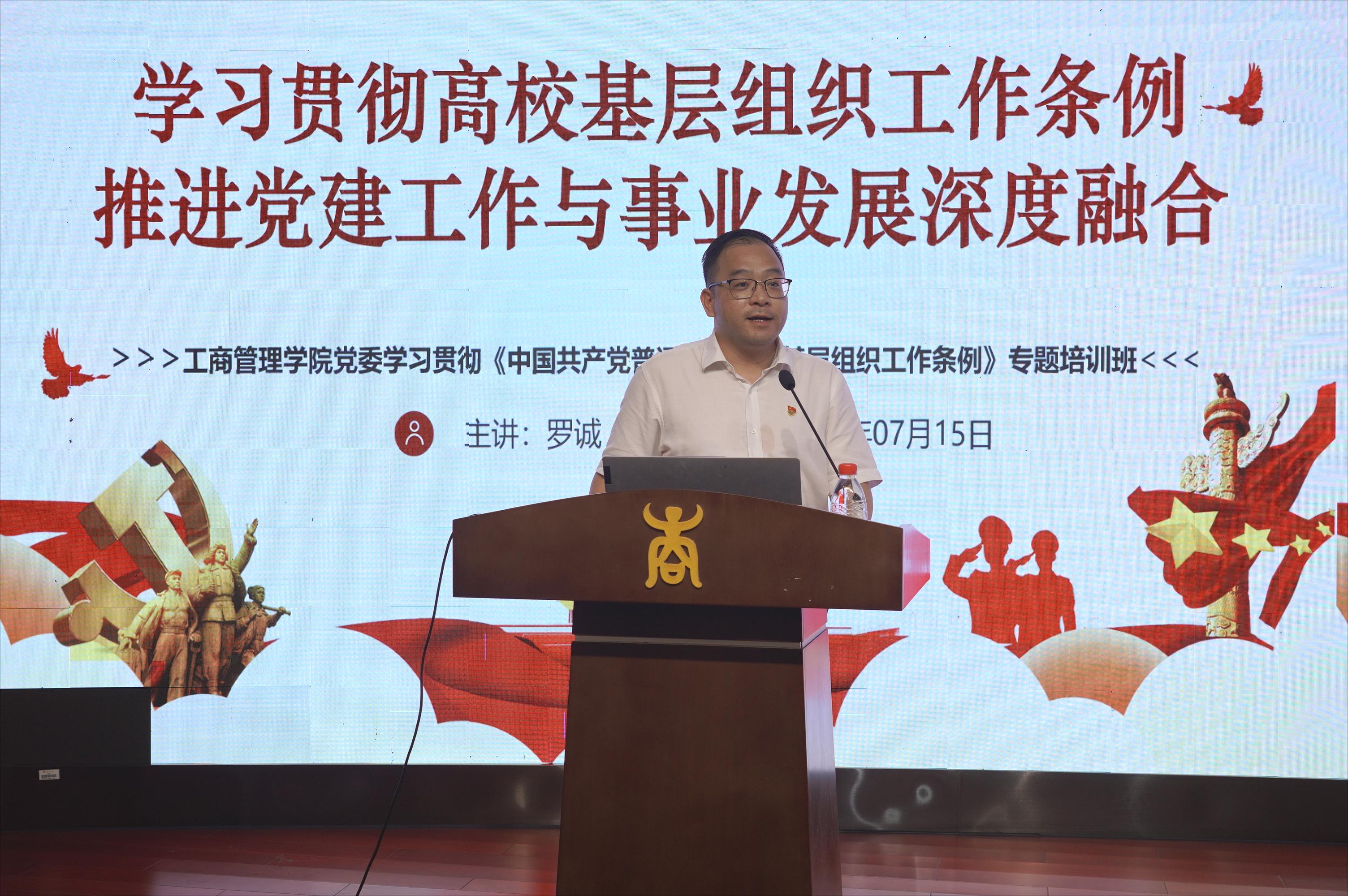 党委学习贯彻《中国共产党普通高等学校基层组织工作条例》(以下简称《条例》)专题培训班在128报告厅举办,院党委书记罗诚作题为《学习贯彻高校基层组织工作条例推进党建工作与事业发展深度融合》的专题辅导讲座。讲座由院党委副书记、纪委书记黄晋主持,学院全体教工党支部和学生党支部书记、副书记、委员及全体辅导员参加。