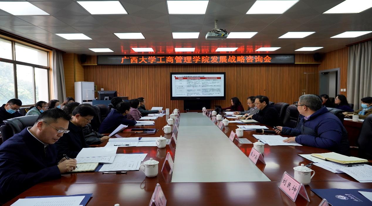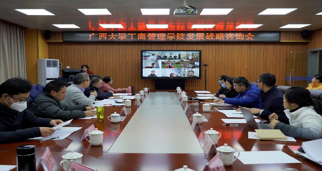 在学院315会议室以线上和线下的形式召开学院发展战略研讨会。南京大学工程管理学院名誉院长、原东南大学副校长盛昭瀚,首都经济贸易大学副校长王永贵教授,北京理工大学管理与经济学院院长王兆华教授,南开大学商学院原院长张玉利,中山大学管理学院原书记谭劲松,北京师范大学教授陈彬,中山大学旅游学院教授张朝枝等专家领导应邀在线上指导;广西壮族自治区政府发展研究中心党组书记、主任杨丛,百色学院党委书记唐拥军,广西教育学院党委书记、院长袁旭,广西电力职业技术学院校长李向红,广西财经学院副校长夏国恩,广西壮族自治区教育厅科研管理处处长黄青云,老王磁力