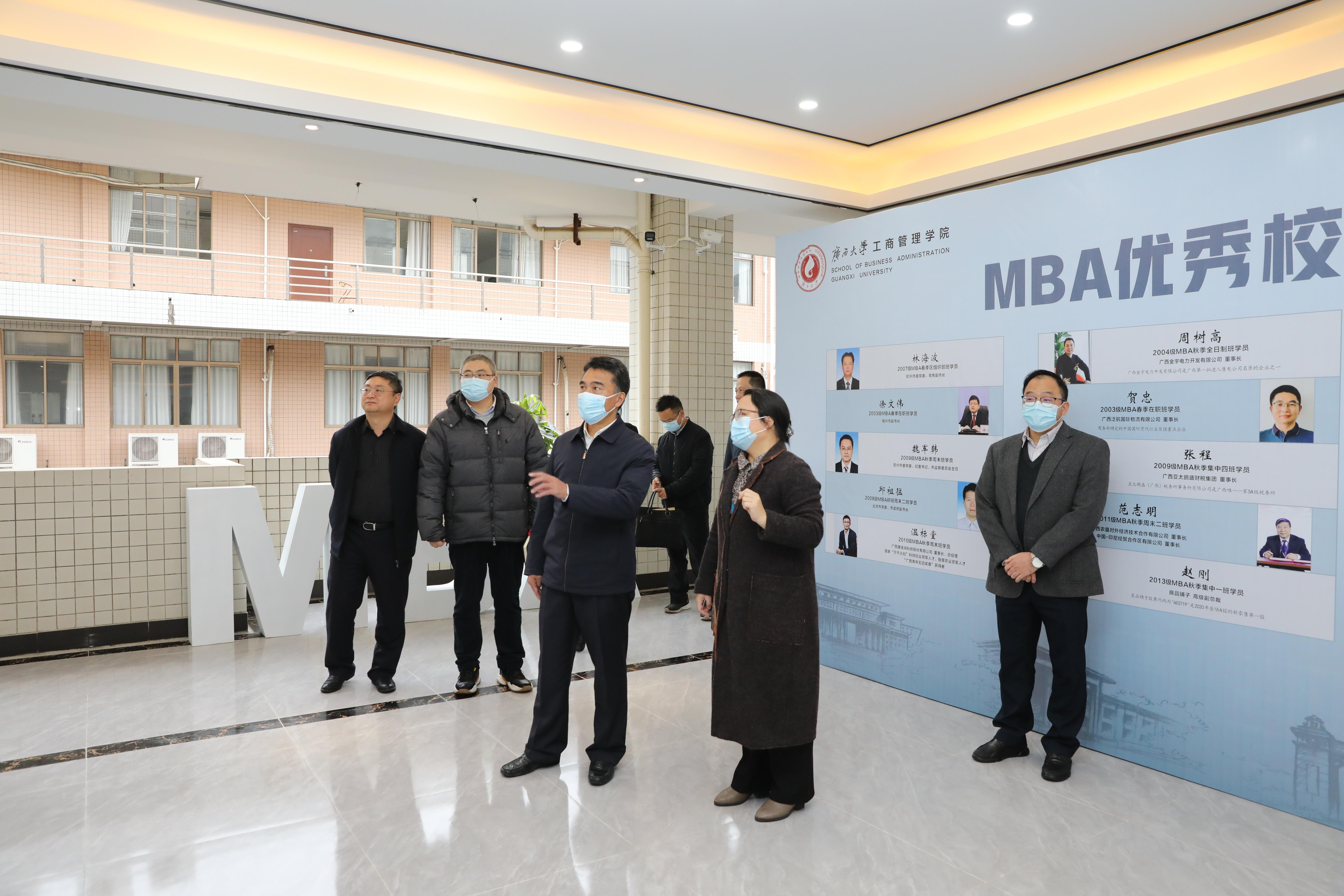 王乃学认真听取学院工作情况汇报,对学院现有的成绩给予了充分的肯定。他强调,一要把工商管理学科建设好,针对各专业分流人数不均衡的情况,可以借鉴国内外成功经验和做法,增强专业吸引力;二要按照学科评估要求高度重视、全力以赴地搞好工商管理博士点建设;三要更多地服务社会、提高社会影响力,多建实习基地,为广西经济建设提供智力支撑;四要加强班子队伍建设,建成精诚团结、一心为公的班子,把党的事业做好,把老王磁力