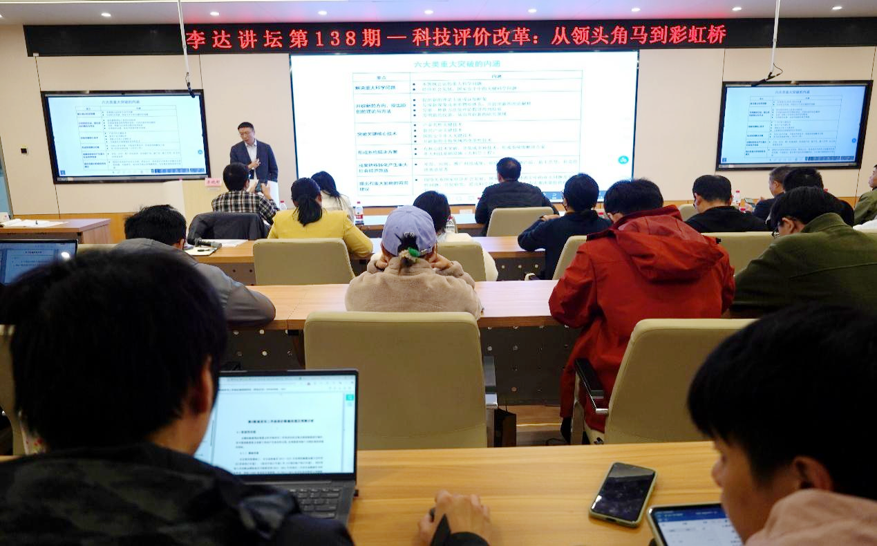 第138期“李达讲坛”,在122报告厅为师生们带来题为“科技评价改革:从领头角马到彩虹桥”的学术报告。学校科研院副院长、社会科学处处长李海波,校质评中心副主任贾历程应邀出席讲坛。学院院长朱帮助教授主持讲坛,学校发规处、科研院相关老师及老王磁力
