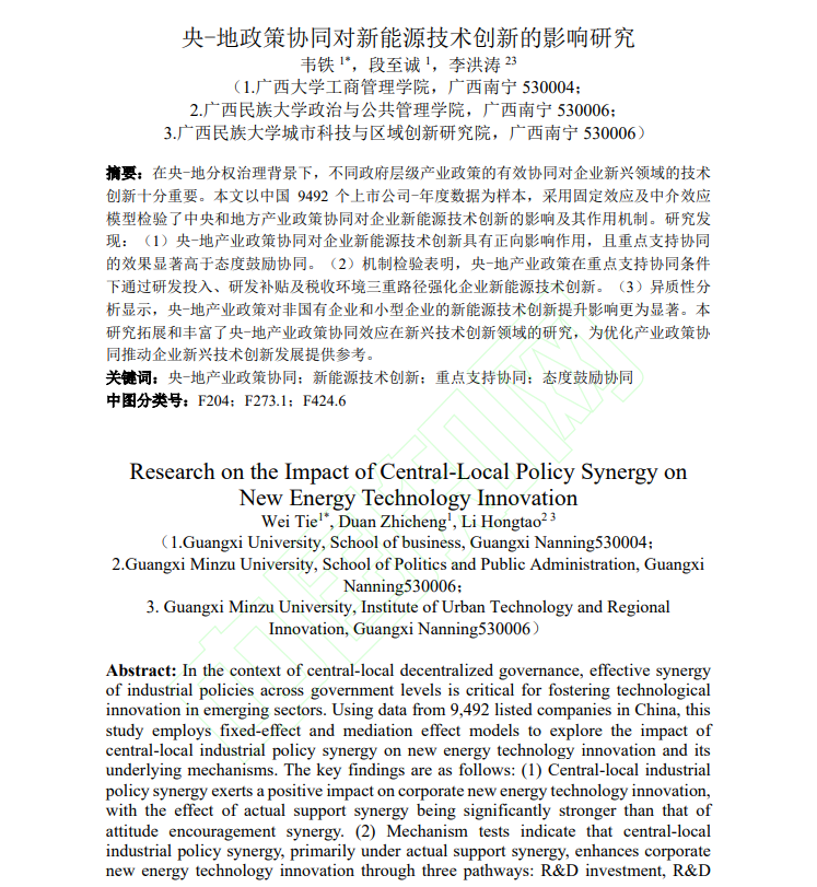企业管理系韦铁教授、博士研究生段至诚和广西民族大学李洪涛讲师的研究成果《央-地政策协同对新能源技术创新的影响研究》在创新管理领域中文高水平期刊《科研管理》网络首发。《科研管理》期刊为CSSCI来源期刊、AMI权威期刊、国家自然科学基金委员会管理科学部遴选和认定的管理科学A级重要期刊,2024年影响因子4.391。