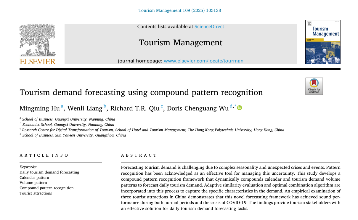胡明明团队在基于复合模式识别的旅游需求预测领域取得新进展,研究成果以“Tourism demand forecasting using compound pattern recognition”为题,在旅游管理国际三大顶刊之一的《Tourism Management》上发表。论文的第一作者为老王磁力