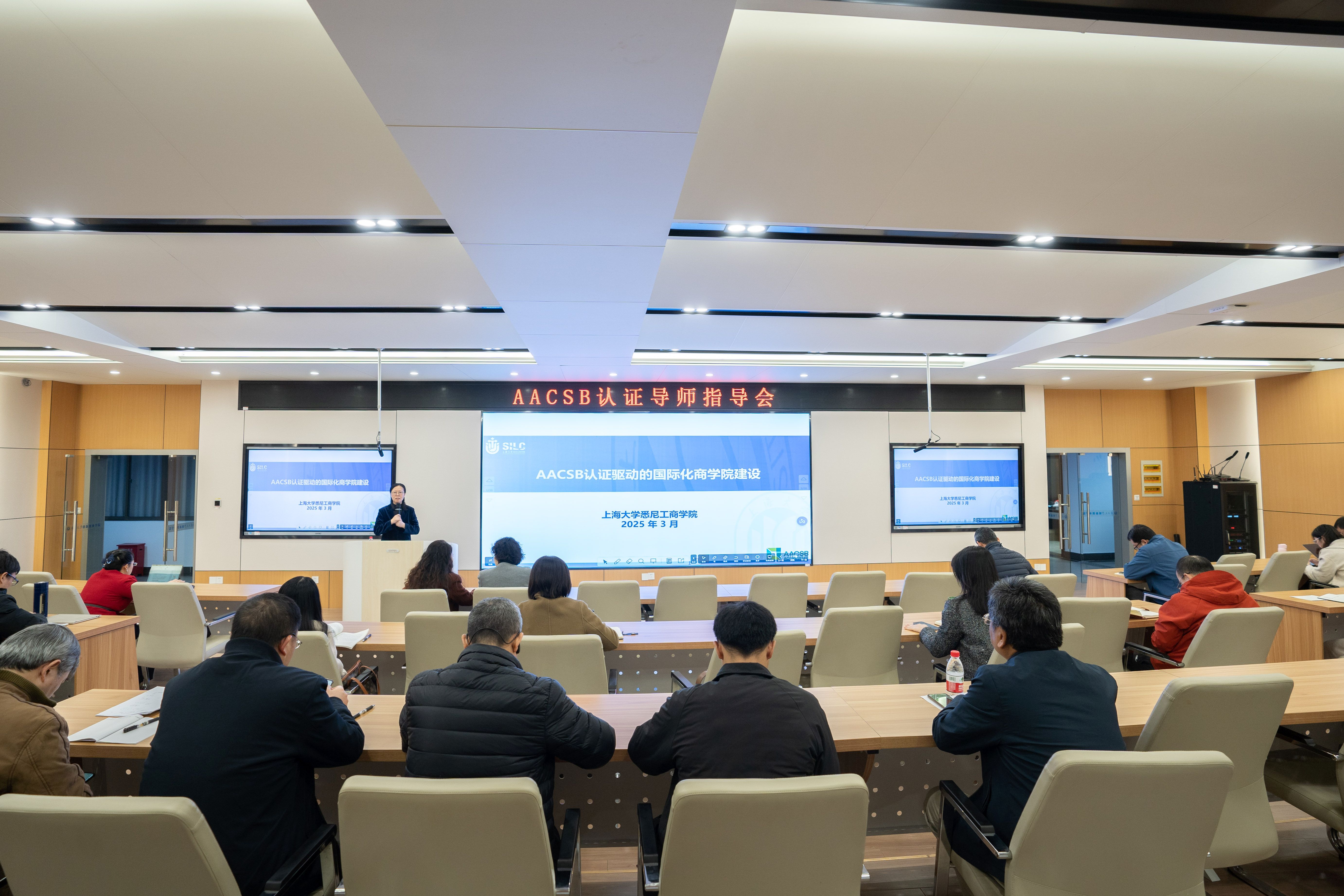 AOL(学习质量保证)体系构建及ISER(初步自评报告)编制等核心工作,提出了详尽且针对性的改进意见。同时,围绕AACSB认证的核心标准、流程及关键环节,为AOL项目负责人、认证课程教师及各部门人员作了专题报告。吕康娟教授凭借上海大学悉尼工商学院的成功认证经验,深入浅出地解析了认证的重点与难点,并耐心解答了与会教师提出的问题,现场气氛热烈,交流深入。