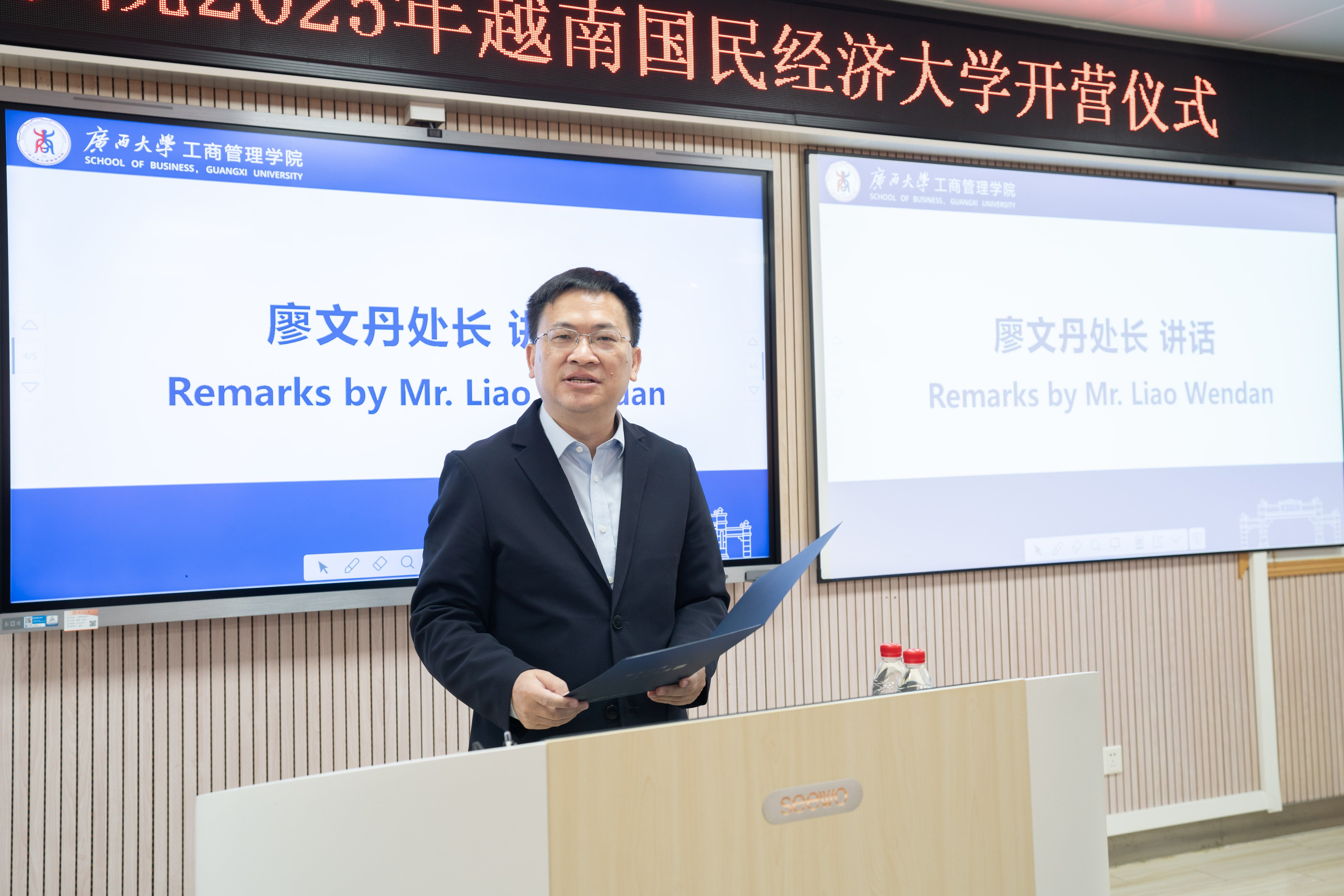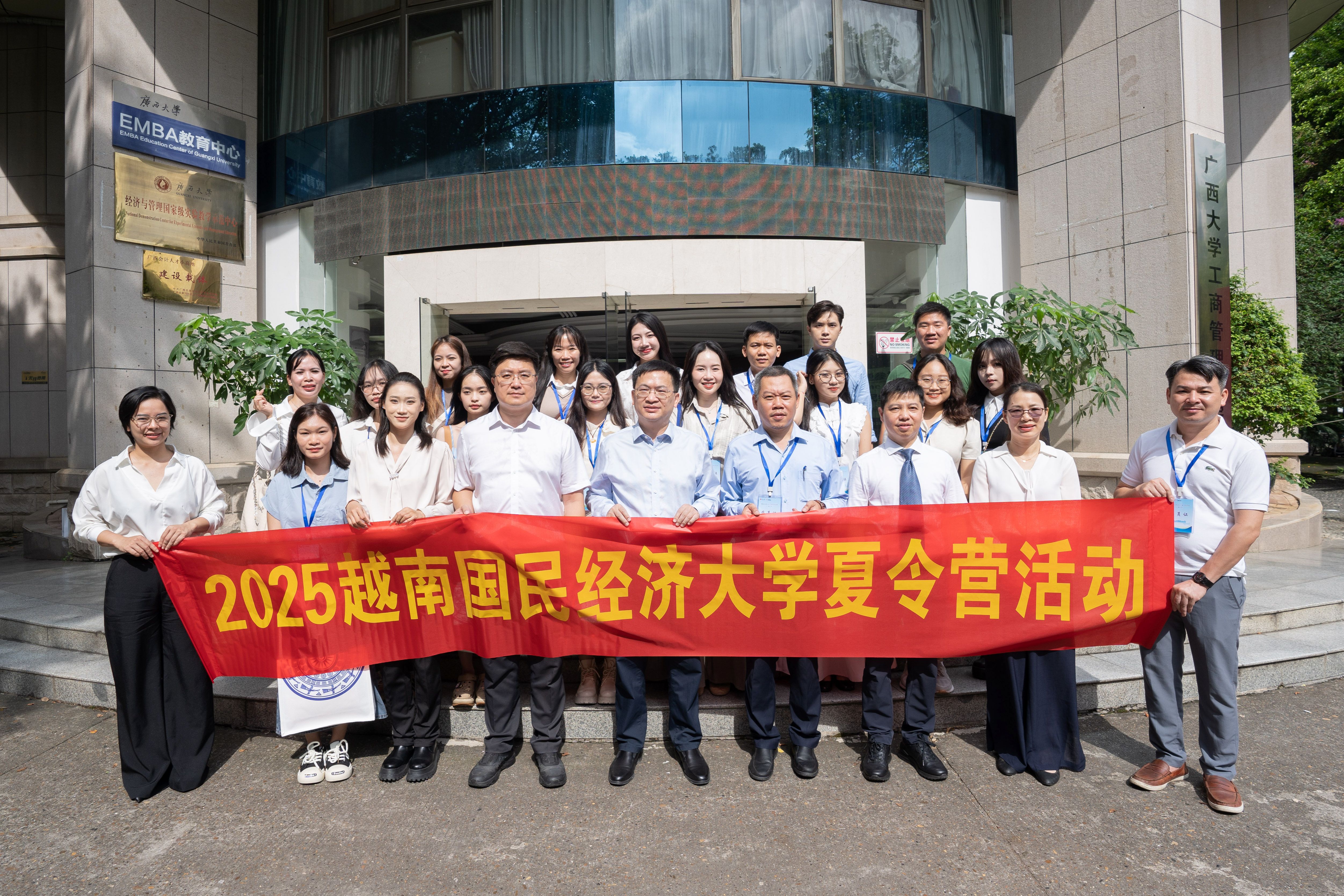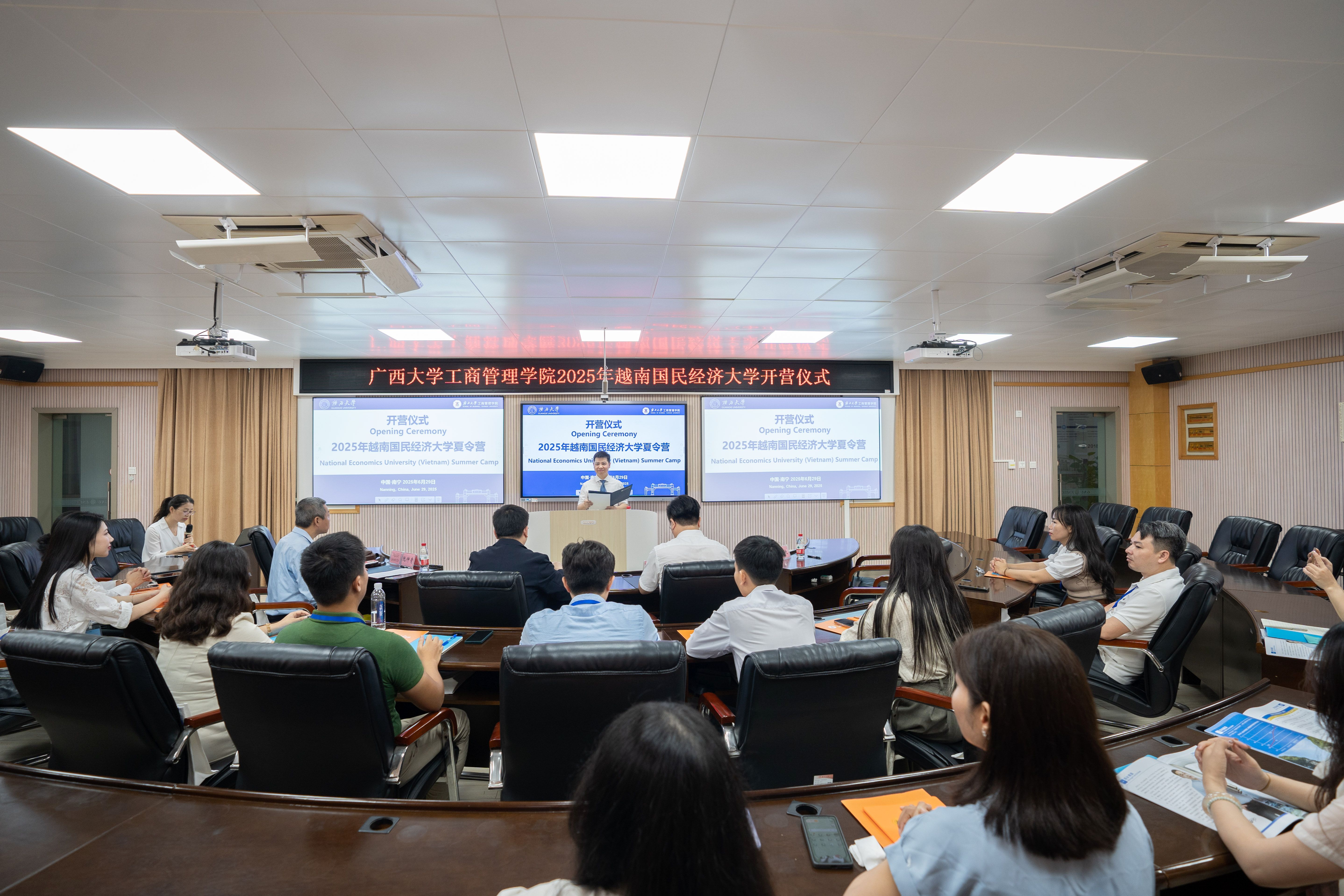 与越南国民经济大学联合举办“2025年越南国民经济大学夏令营”活动。6月29日上午,夏令营开营仪式在学院511教室举行。我校国际交流与合作处处长廖文丹,学院党委书记黄晋,越南国民经济大学教师代表阮仲青(Nguyễn Trọng Thanh)出席仪式。院长助理韦铁主持仪式,越南国民经济大学19名师生参加仪式。