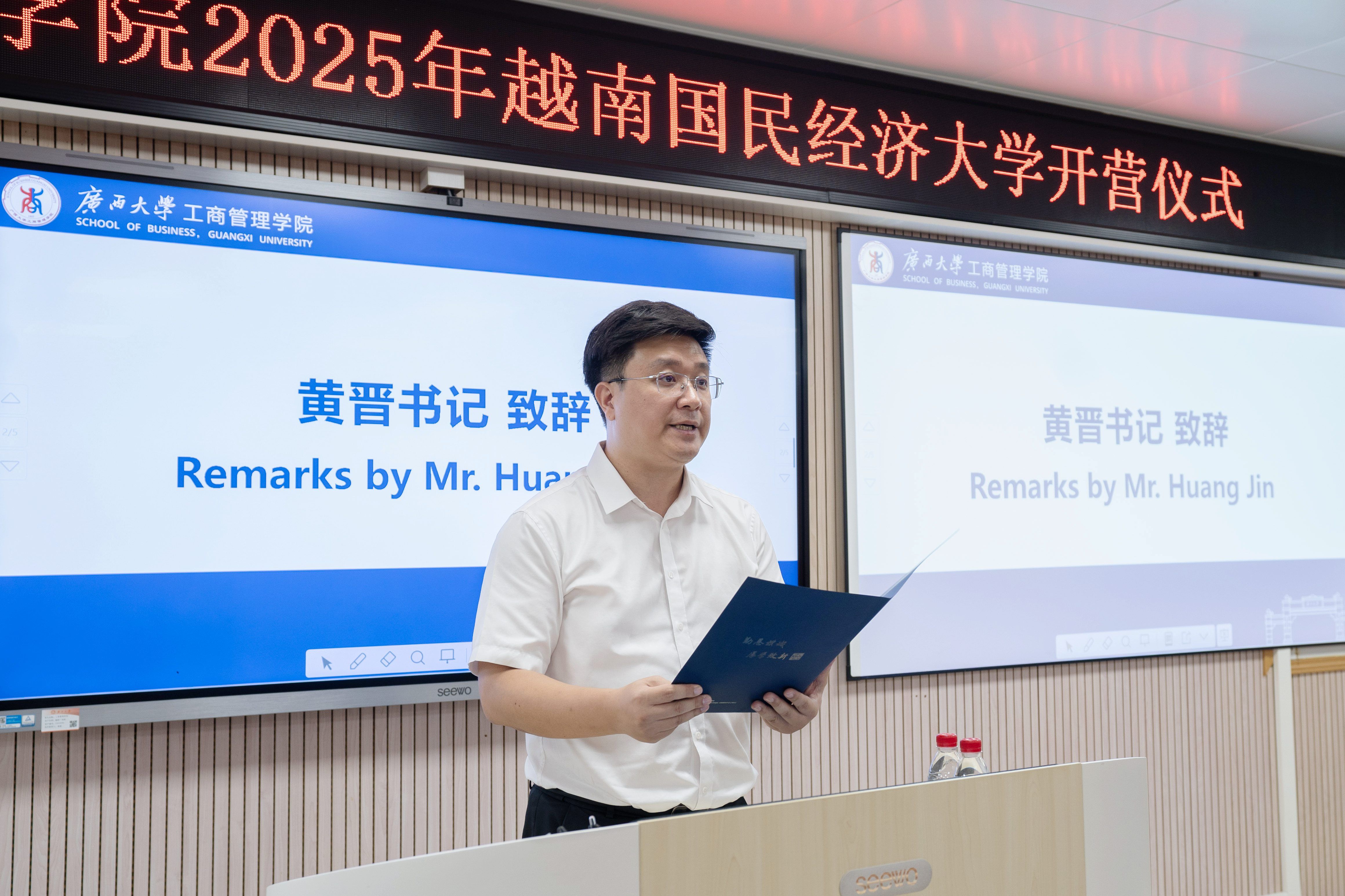 黄晋回顾了中越“同志加兄弟”的传统友谊,强调青年交流对深化两国关系的重要性。他介绍了学院的发展历史和在商科教育领域取得的成绩,他指出,本次精心筹备的夏令营,是学院国际化办学理念的生动诠释,希望学员们通过课程学习、企业参访与文化体验,深入了解中国经济发展模式,感受广西多元文化魅力,成为中越友好合作的见证者与参与者。