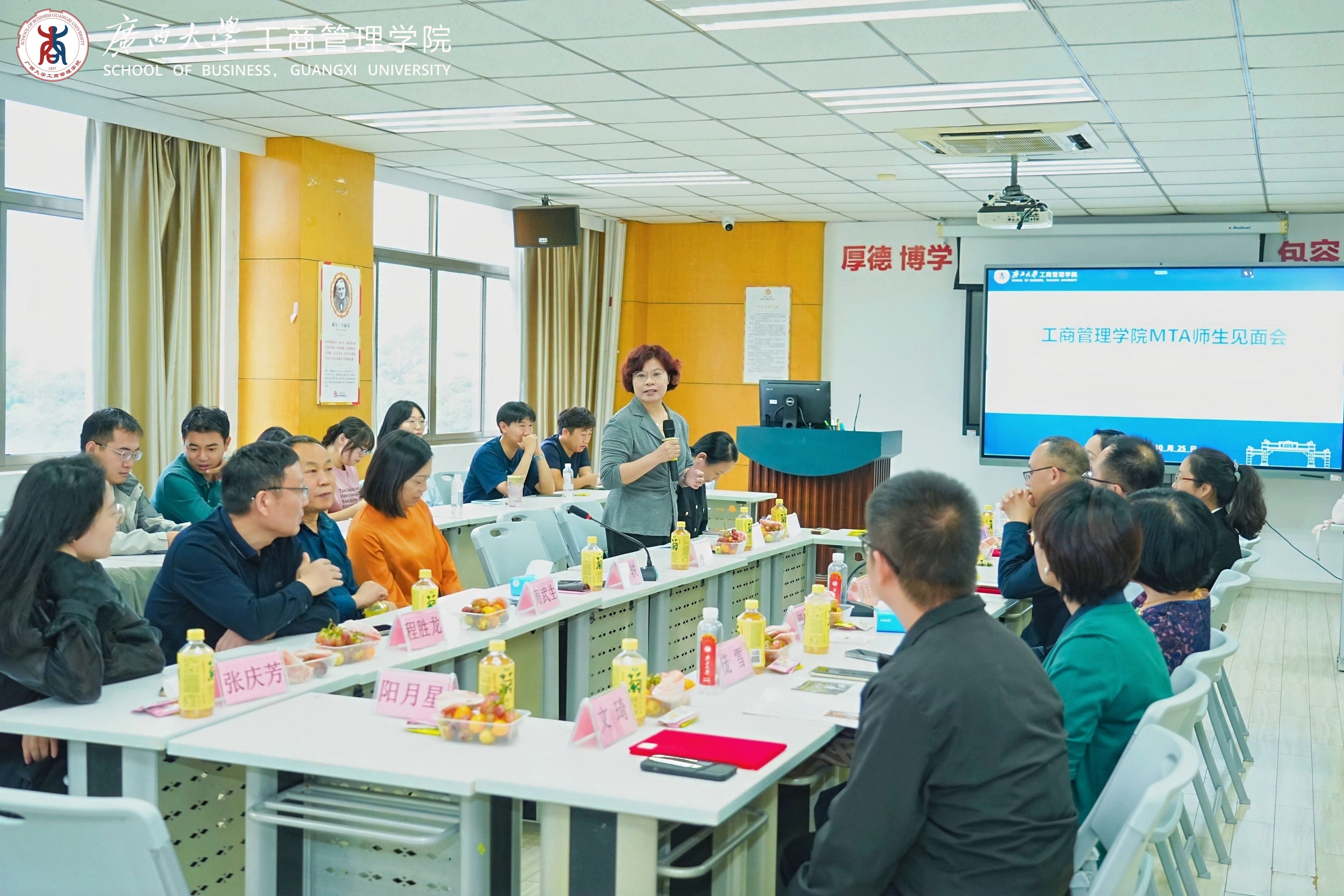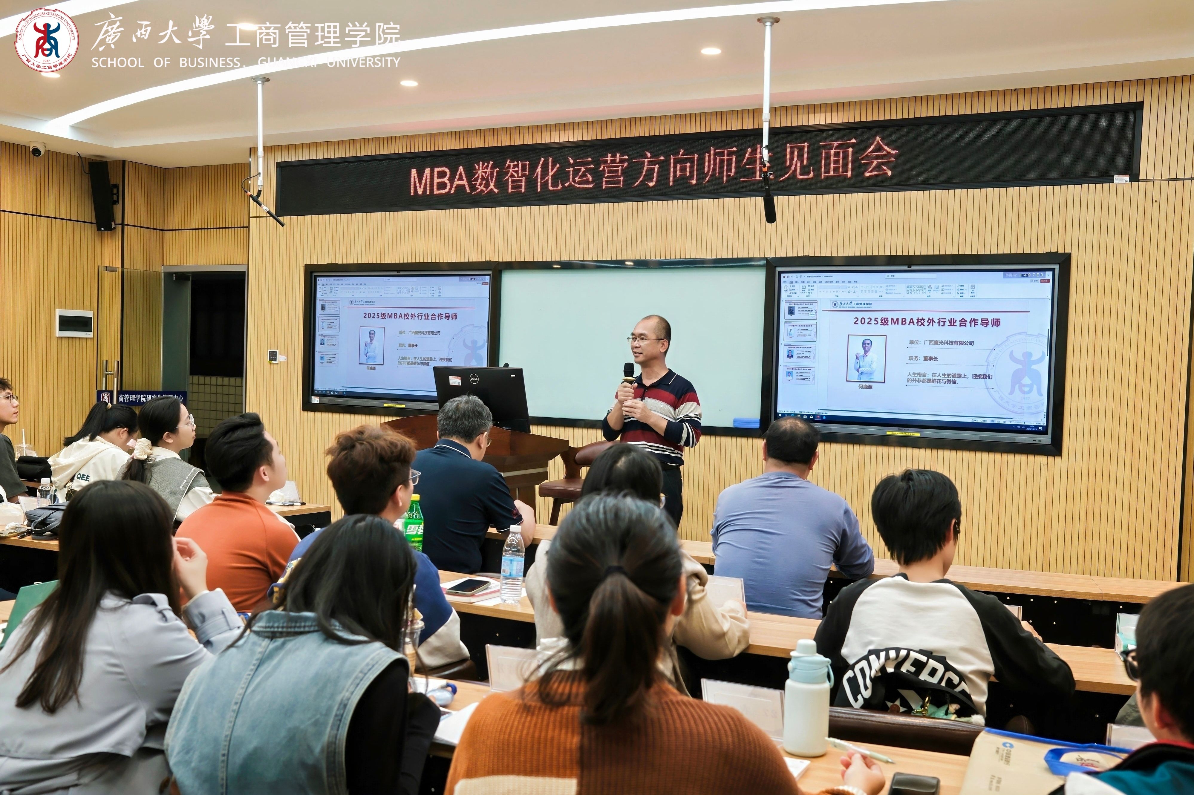当晚,多场师生见面会分别在学院各教室同步举行,覆盖MBA各方向(科技产业运营、中国-东盟国际商务管理、数智化运营管理、科技金融、企业经营与管理五大模块)、EMBA、会计硕士和旅游管理硕士等项目。各位导师从专业学习、工作实践与行业发展等多个角度,与学生们亲切深入交流,加深了同学们对各行各业的认知,助力同学们将理论与实践相结合,为今后的学习研究奠定基础。