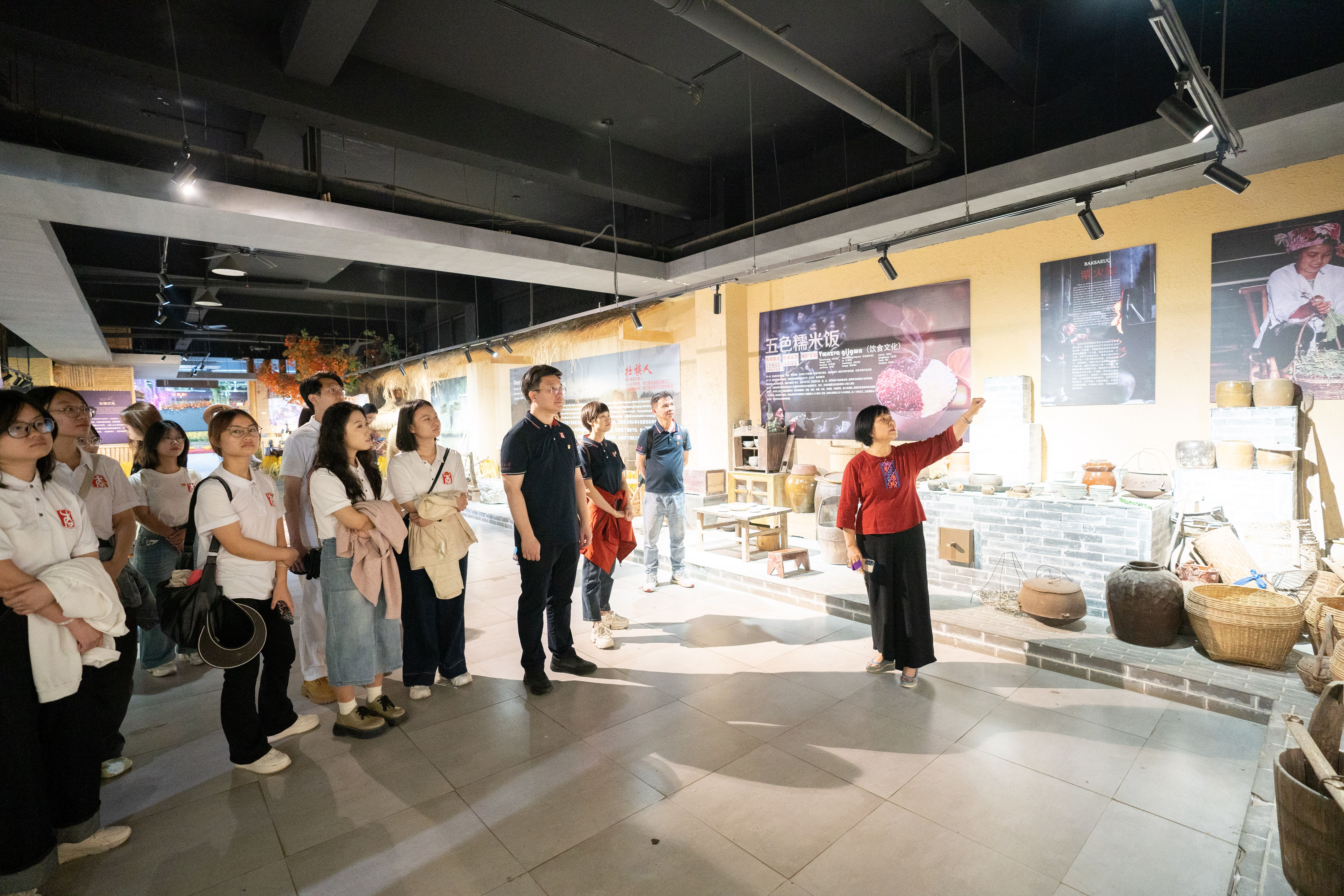 师生们首先来到壮乡民俗非遗馆,开启了一场民族文化展览之旅。在馆内,大家近距离欣赏了壮族傩戏面具、壮锦等珍贵的非遗物品。每一件展品都承载着壮族悠久的历史和深厚的文化底蕴,讲解员详细地介绍让师生们对壮族传统文化有了更深入的了解。大家纷纷驻足观看,不时发出阵阵惊叹,对壮族人民的智慧和创造力表达了由衷的敬佩。