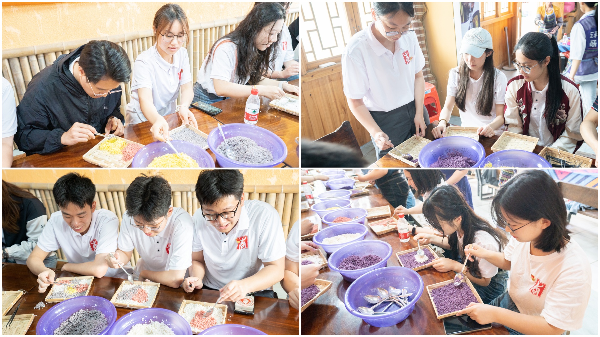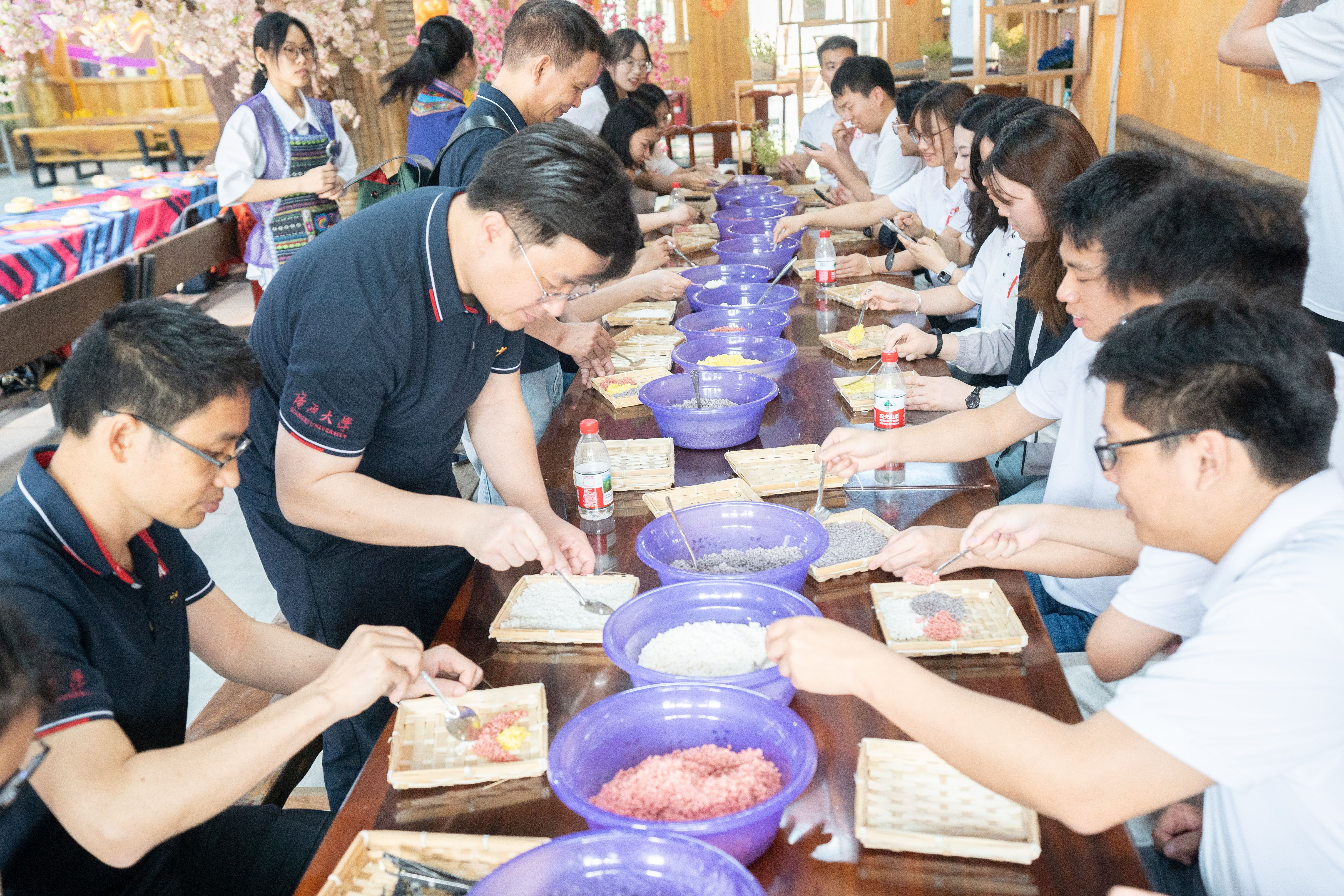 动手制作五色糯米饭的环节同样引人入胜。师生们围坐在长桌旁,桌上摆满了糯米、植物染料和各种制作工具。在专业老师的指导下,大家小心翼翼地将红、黄、黑、白、紫的糯米创意地制作自己喜欢的图案。大家一边操作,一边交流,了解了糯米饭的染色技艺以及“五色”的文化内涵,现场气氛热烈融洽。