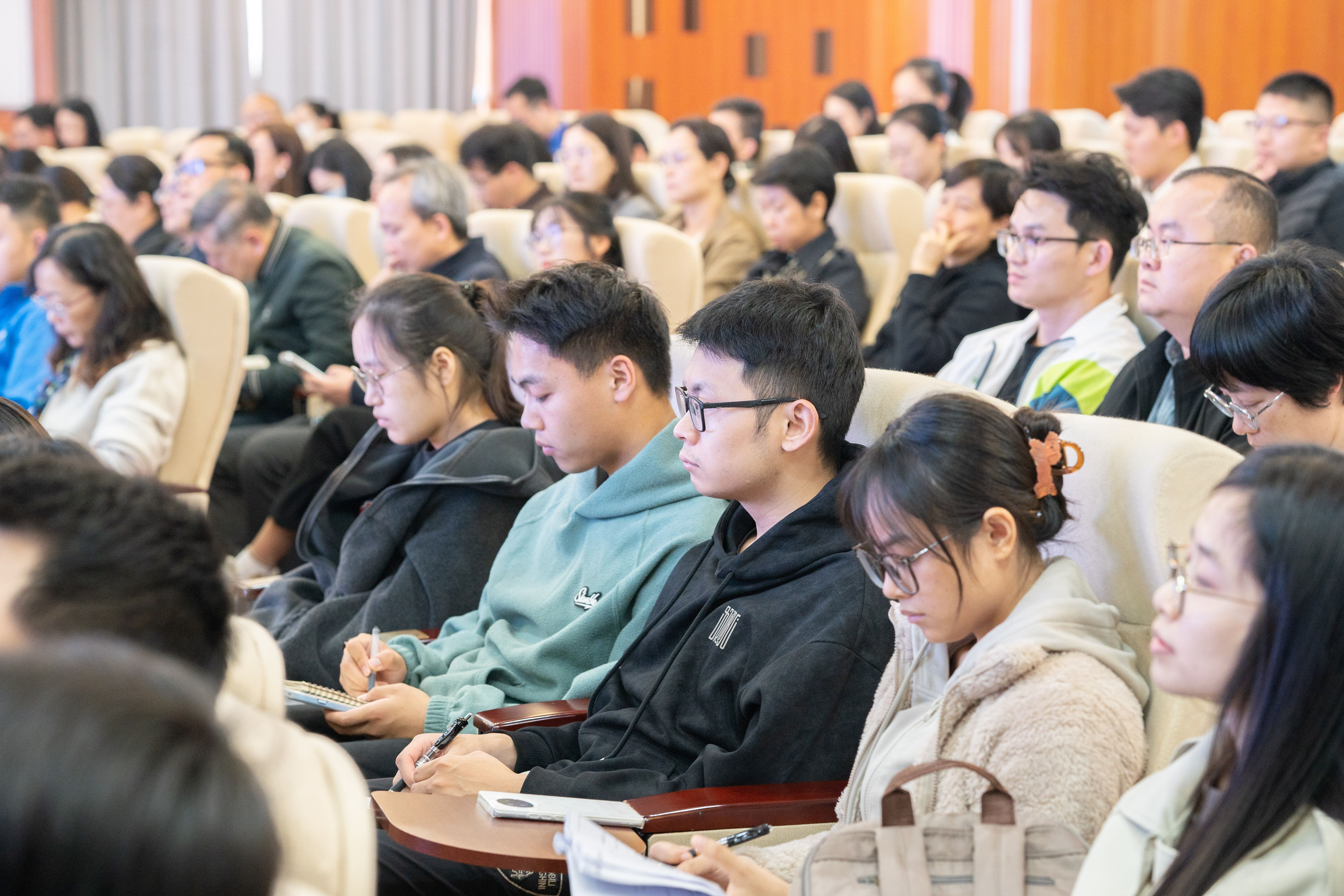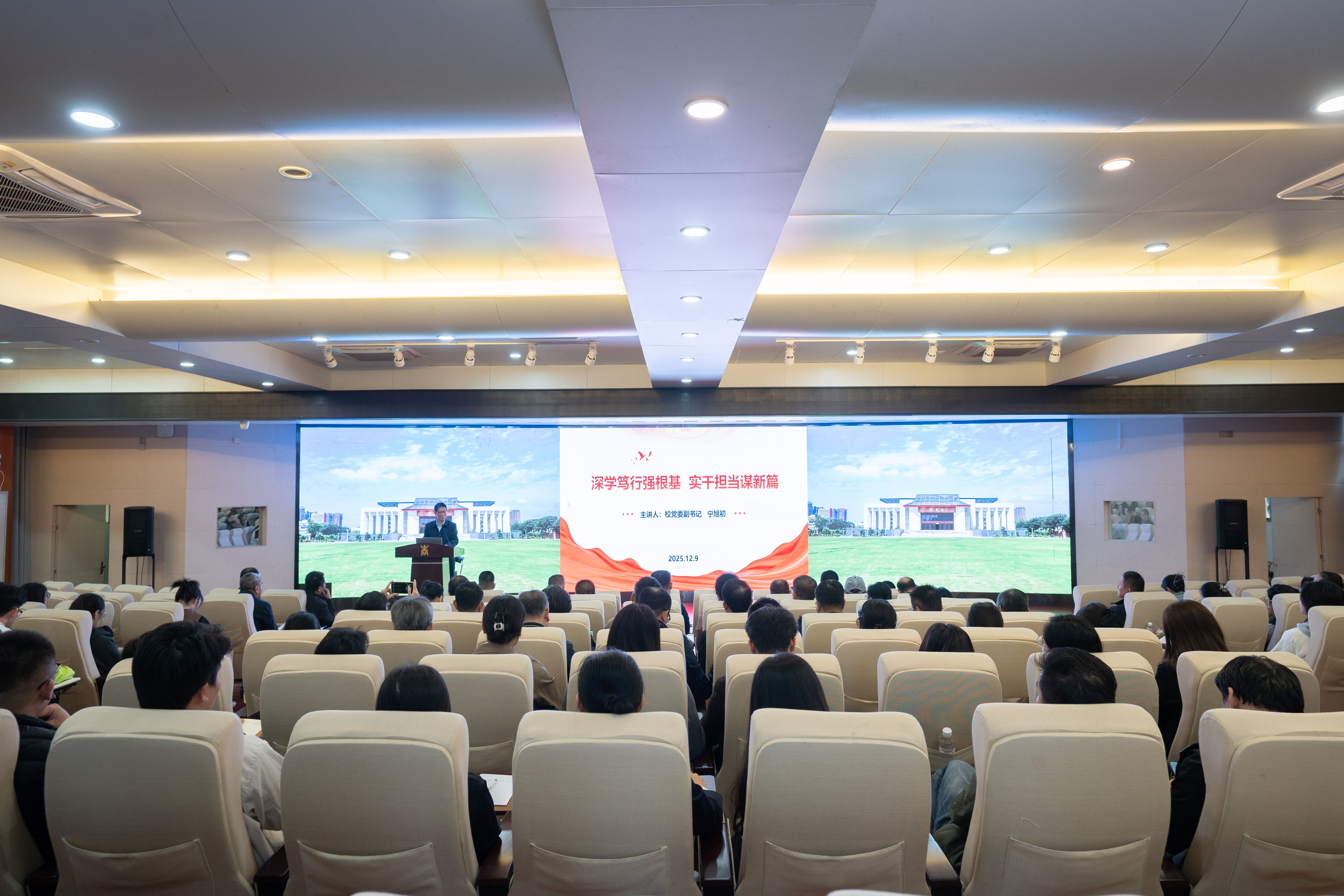 宁旭初从“筑牢思想根基、找准定位坐标、明晰实践路径”三个方面讲授。他指出,“深学笃行”是基础,“实干担当”是关键。全体党员要持续深入学习党的创新理论,特别是党的二十届四中全会提出的“六个坚持”原则,并将其贯穿于学习、科研与工作实践中,真正把学习成果转化为推动发展的实际成效。他系统回顾了学校“十四五”期间在党建引领、学科突破、人才培养、科技服务、治理提升等方面取得的标志性成就,实事求是地剖析了学校当前存在的短板,强调面对“十五五”新形势新任务,必须坚持问题导向,在巩固既有成果基础上,勇于突破难点、打通堵点,在“十五五”期间着力破解发展难题。