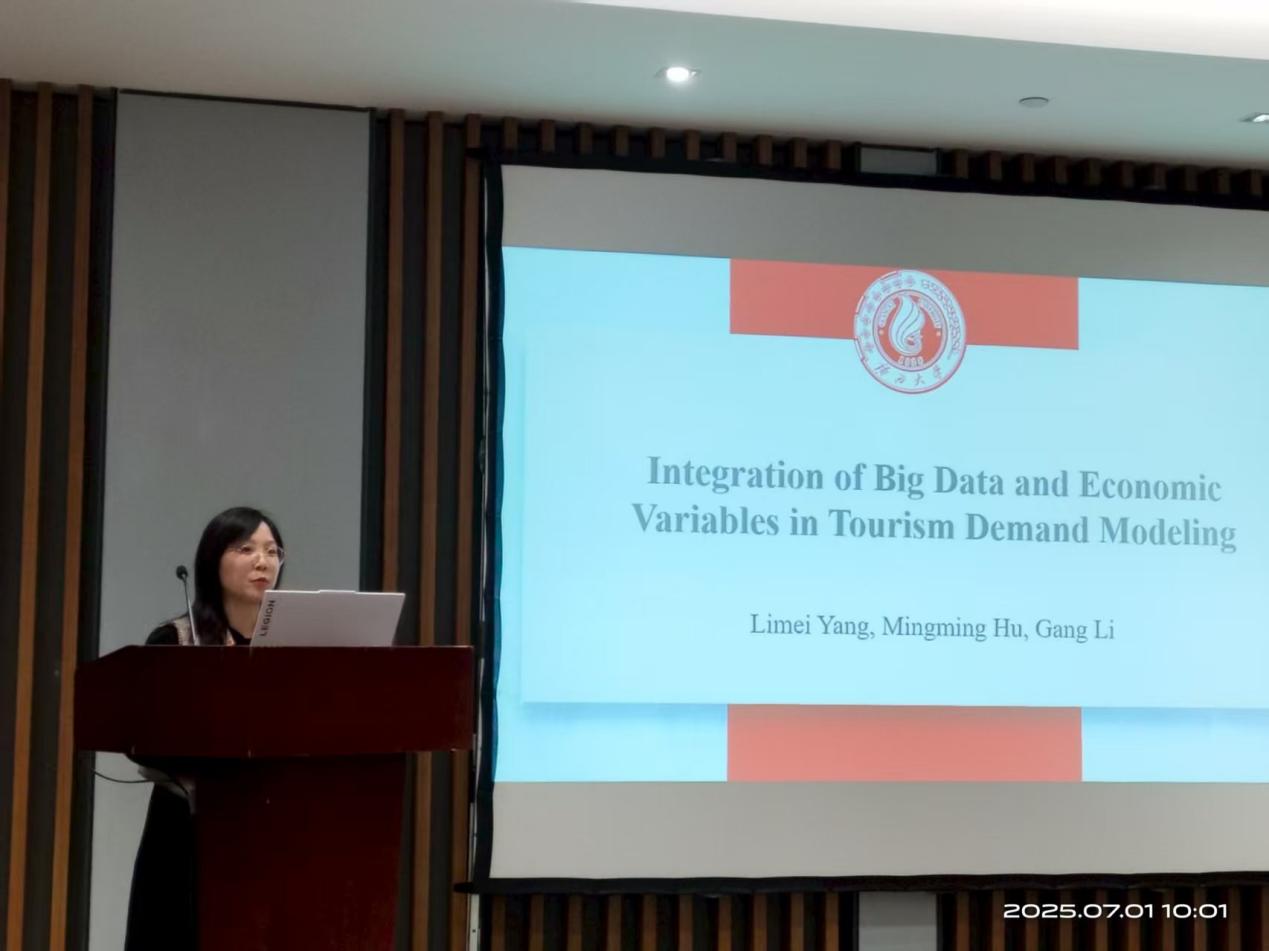 在会议上杨丽梅同学汇报了自己的研究成果《Integration of Big Data and Economic Variables in Tourism Demand Modeling(基于大数据和经济变量整合的旅游需求建模)》,该论文实证分析检验游客在线信息搜索行为对旅游价格、收入与旅游需求关系的调节效应。