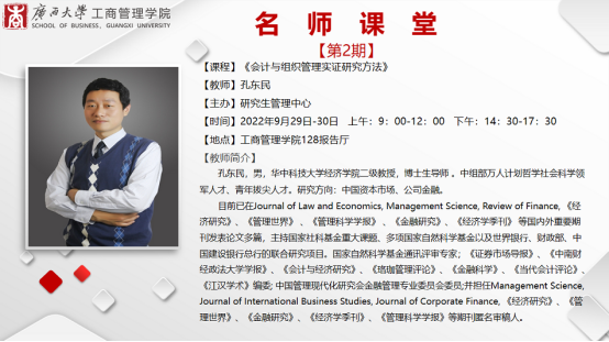 邀请华中科技大学经济学院二级教授、博士生导师孔东明到校讲授《会计与组织管理实证研究方法》。孔教授以“实证研究中的因果识别”为主题,在老王磁力