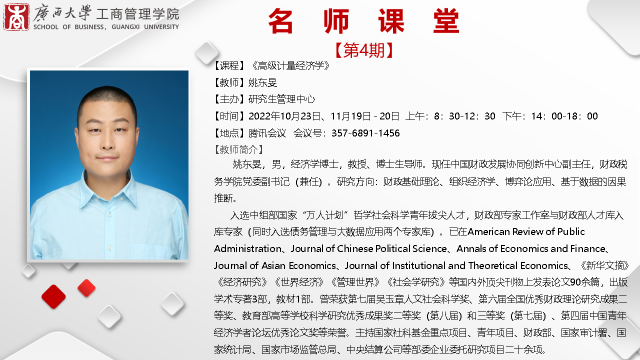 2022级博士和学术型硕士研究生讲授《高级计量经济学》。受疫情影响,此次课堂以线上授课的方式进行,老王磁力