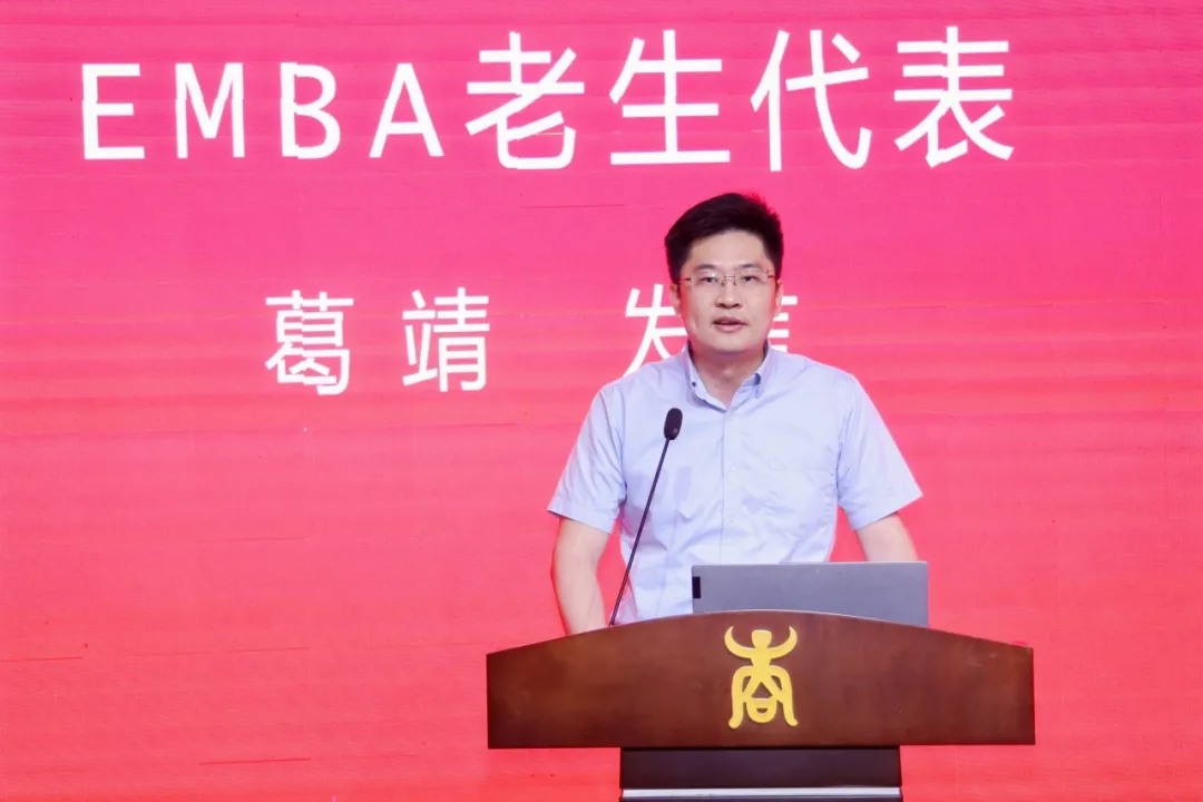 老生代表葛靖代表往届EMBA师兄师姐,对2024级EMBA新生加入EMBA大家庭表示热烈的欢迎。他分享了过去一年EMBA学习期间四个关键词——“挑战”、“勤学”、“交流”、“时间管理”的收获与感悟。最后他祝愿同学们在学习和事业上取得更大的成就,也祝愿学院EMBA项目越办越好。