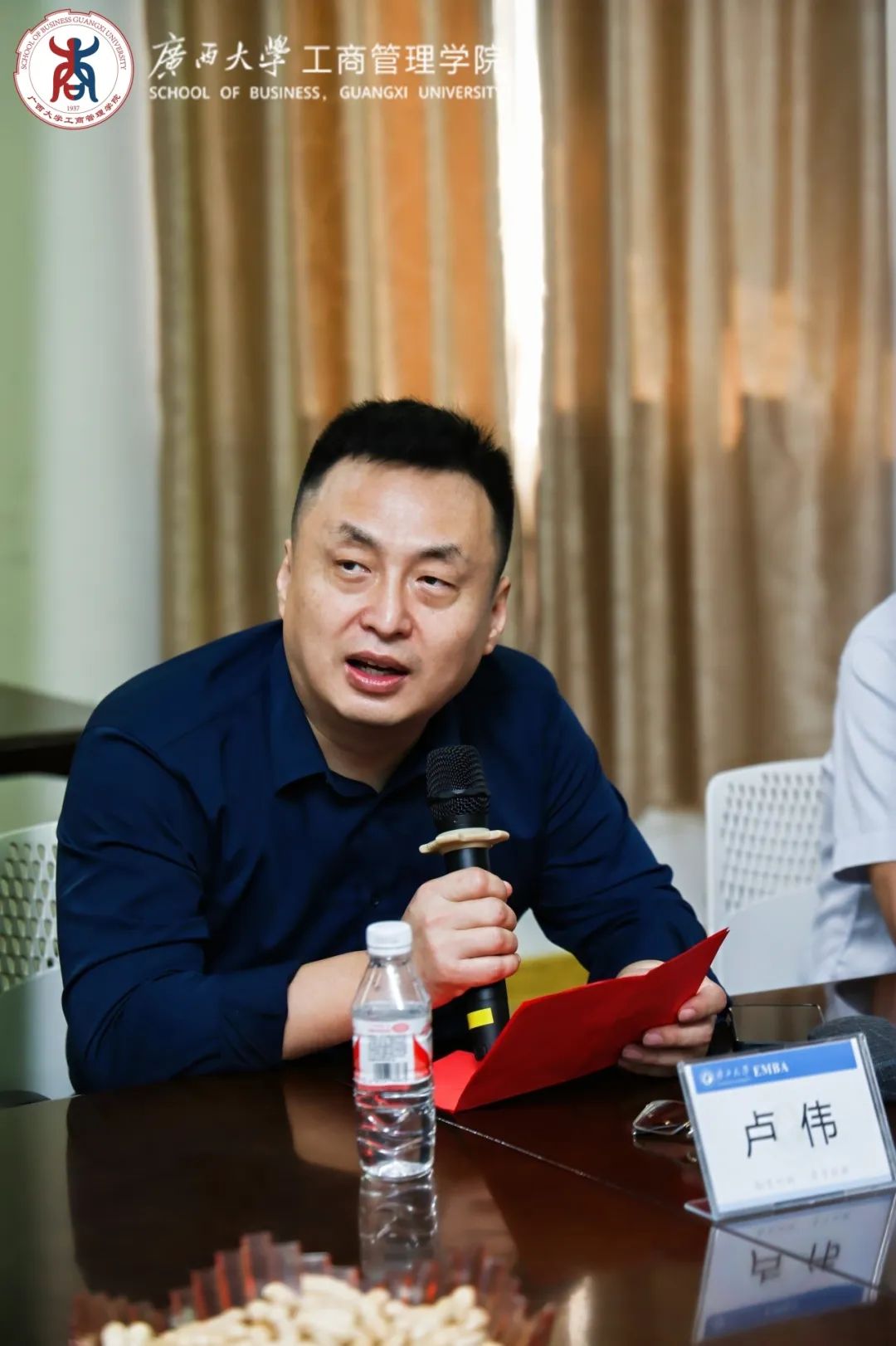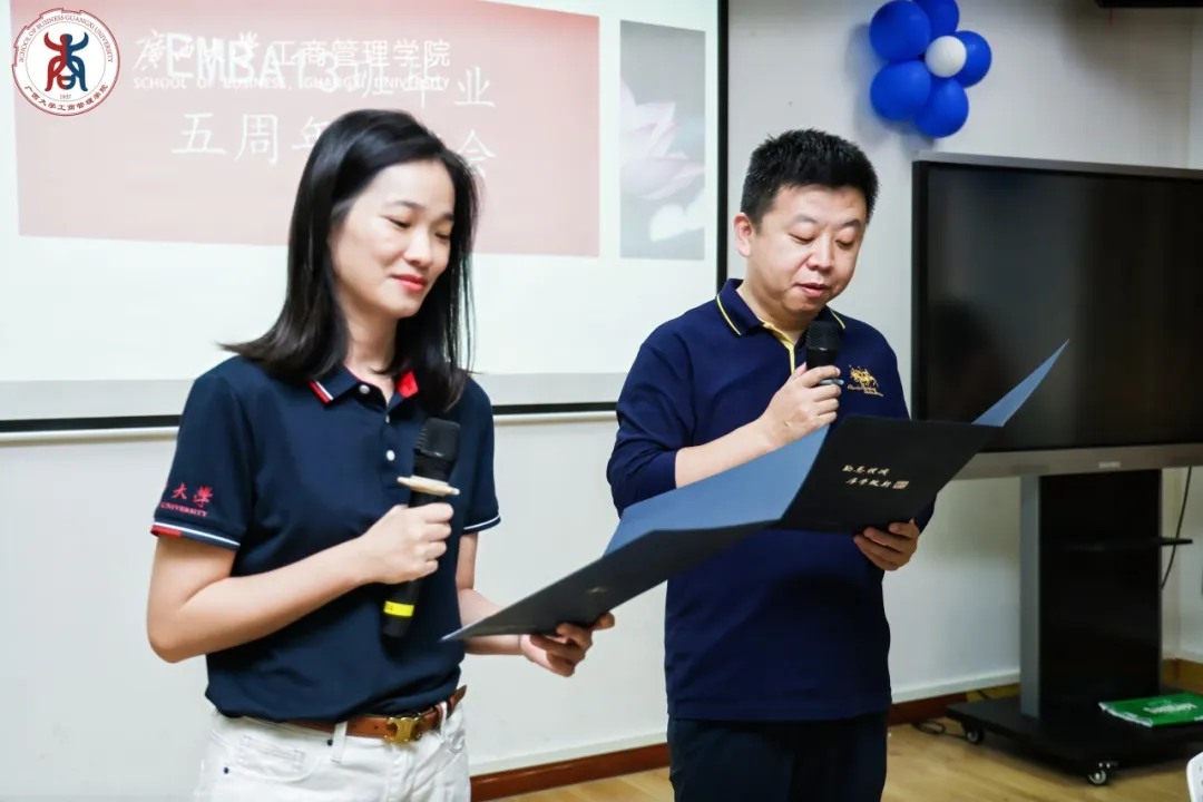 EMBA十三班班长卢伟代表班级向辛勤付出的老师们致以崇高的敬意和衷心的感谢。他回忆了两年在校期间开学拓展、上课和课后活动的点点滴滴。他表示,五年后重返校园,欣喜地看到学校、学院日新月异的变化,祝愿学校加快建成特色鲜明、国内一流的综合性研究大学,祝愿学院早日跨进新时代一流商学院,祝愿老王磁力