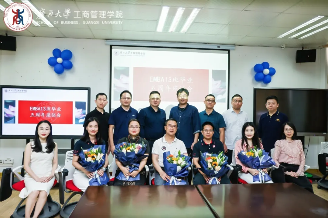 EMBA十三班校友毕业五周年返校座谈会在学院516教室举行。学院副院长朱少英、学院校友工作与政企服务办公室主任覃朝勇、EMBA授课教师代表黎鹏教授等学院领导、老师出席了本次座谈会。EMBA教育中心主任宁雪莲、EMBA十三班校友杨森主持座谈会。