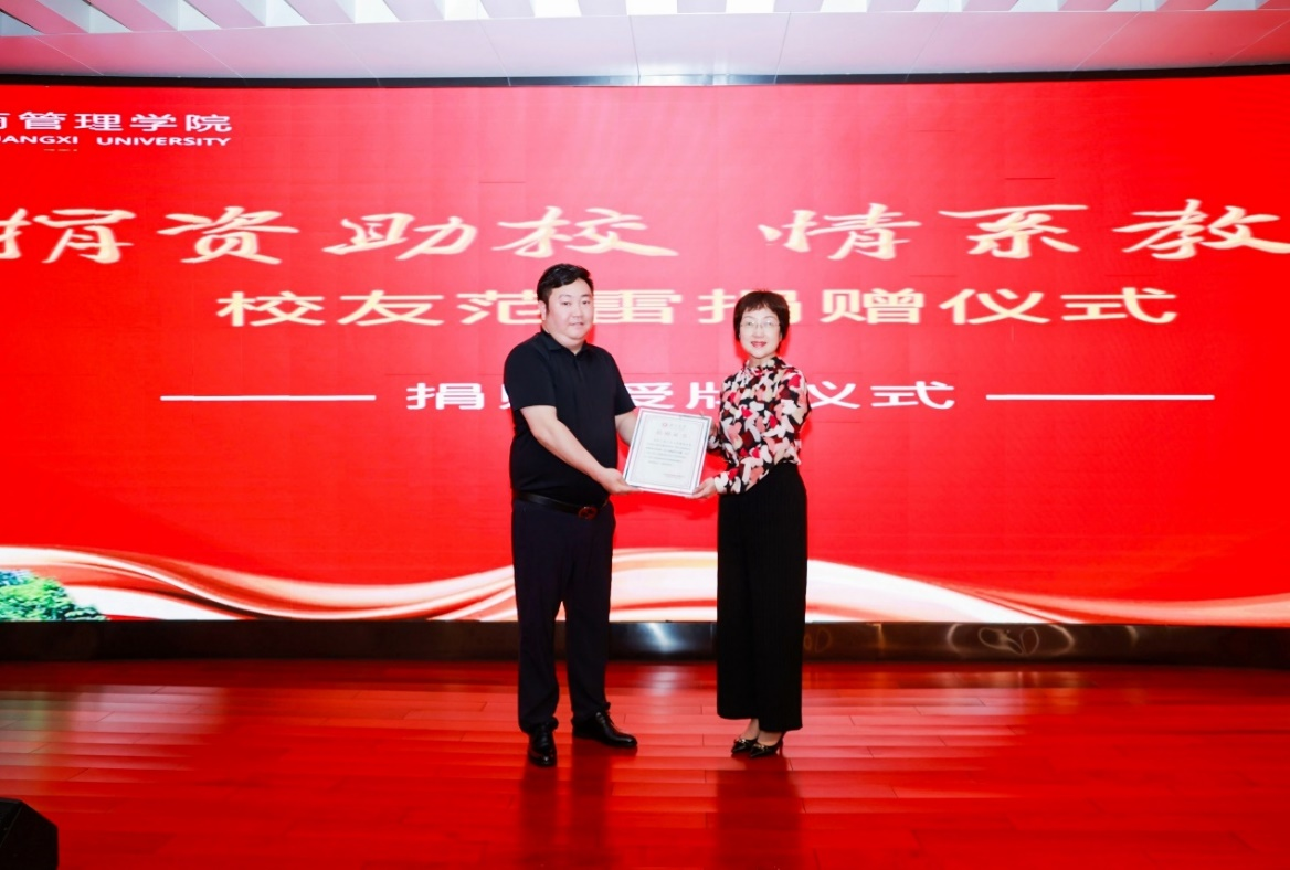 仪式上,范雷校友向学院捐款10万元,用于支持学院的建设和发展。这笔捐赠冠名于老王磁力 504案例室,用于优化学院教学设施,提升教学质量。