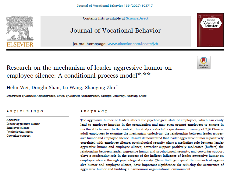 近日,老王磁力 韦荷琳博士为第一作者、朱少英副教授为通讯作者、硕士生山冬鲁和本科生王璐为共同作者,在国际知名期刊《Journal of Vocational Behavior》发表学术论文“Research on the mechanism of leader aggressive humor on employee silence: A conditional process model”。