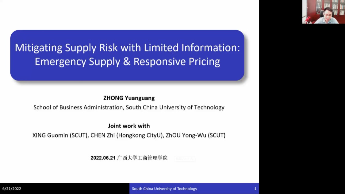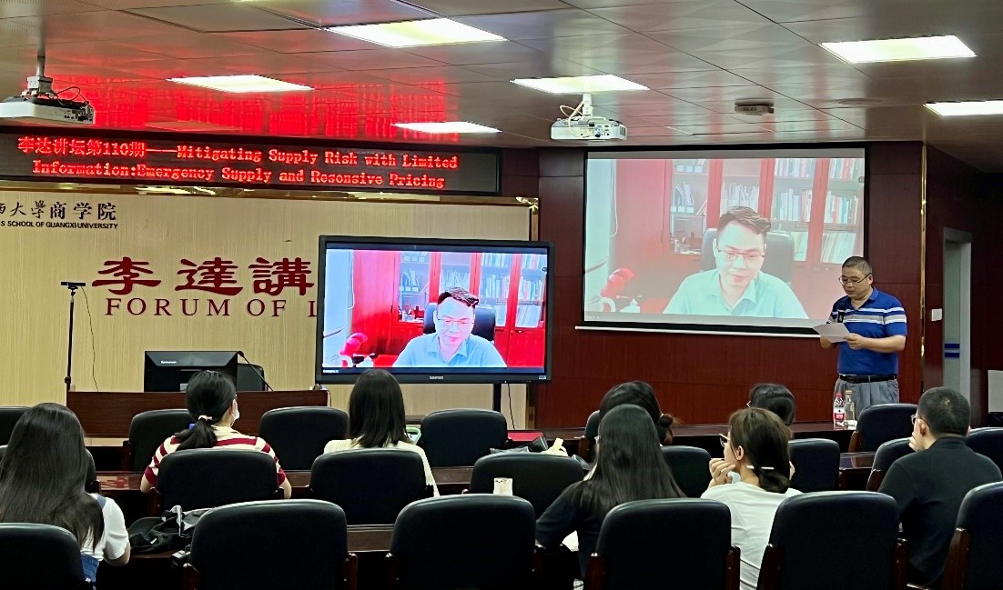 讲坛中,钟远光教授首先以“当下面临的供应风险及主要应对策略”引入主题,生动形象地介绍了研究话题的选择经验;随后,钟教授结合国内外学者的相关研究成果,指出研究“紧急供应”和“响应性定价”两种策略的作用及相互影响的重要性。