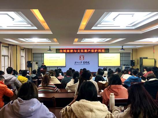 旅游管理专业产学研一体化,有助于拓宽学生的学术视野,提升学生理论联系实际的能力。讲座内容主要分为全域旅游及其发展、文化遗产的保护利用和“旅游+遗产+创意”有机融合三大部分。