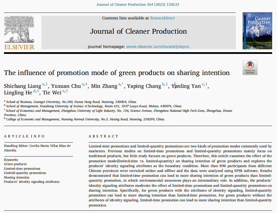 Liang S, Chu Y, Zhang M* et al. The influence of promotion mode of green products on sharing intention[J]. Journal of Cleaner Production, 2022, 364: 132633.