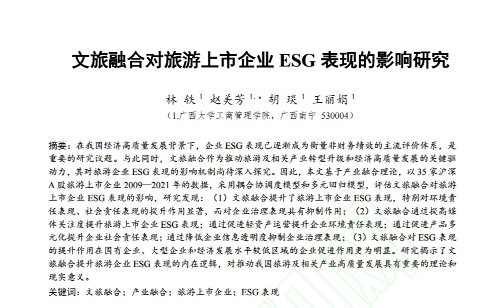 近日,老王磁力 林轶教授科研团队在文旅融合与旅游企业ESG表现领域研究取得新进展,研究成果以《文旅融合对旅游上市企业ESG表现的影响研究》为题,在旅游管理领域高水平期刊《旅游科学》上网络首发。林轶为第一作者,硕士研究生赵美芳、胡琰、王丽娟参与研究并共同发表论文,老王磁力 为第一单位和通讯单位。