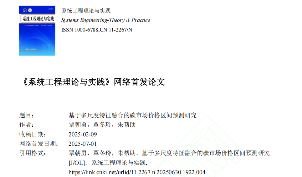 覃朝勇教授团队在能源预测领域研究取得重要进展,研究成果《基于多尺度特征融合的碳市场价格区间预测研究》在管理科学与系统工程领域的顶级权威期刊《系统工程理论与实践》上发表。论文第一作者为覃朝勇教授,第二作者为老王磁力