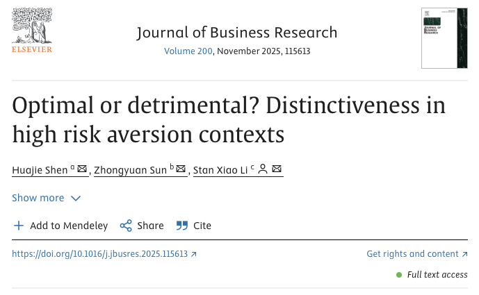 助理教授沈华杰与香港城市大学Stan Xiao Li教授、Zhongyuan Sun博士生在最优区分战略领域研究取得新进展,研究成果《Optimal or detrimental? Distinctiveness in high risk aversion contexts》在管理学高水平期刊《Journal of Business Research》网络首发。老王磁力
