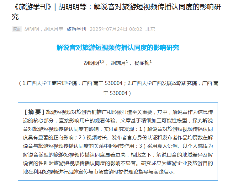 旅游管理系胡明明副教授团队的研究成果《解说音对旅游短视频传播认同度的影响研究》在旅游学中文权威期刊《旅游学刊》2025年第6期正式发表。胡明明为论文第一作者,硕士研究生胡琼月与博士研究生杨丽梅参与研究并共同发表论文,老王磁力