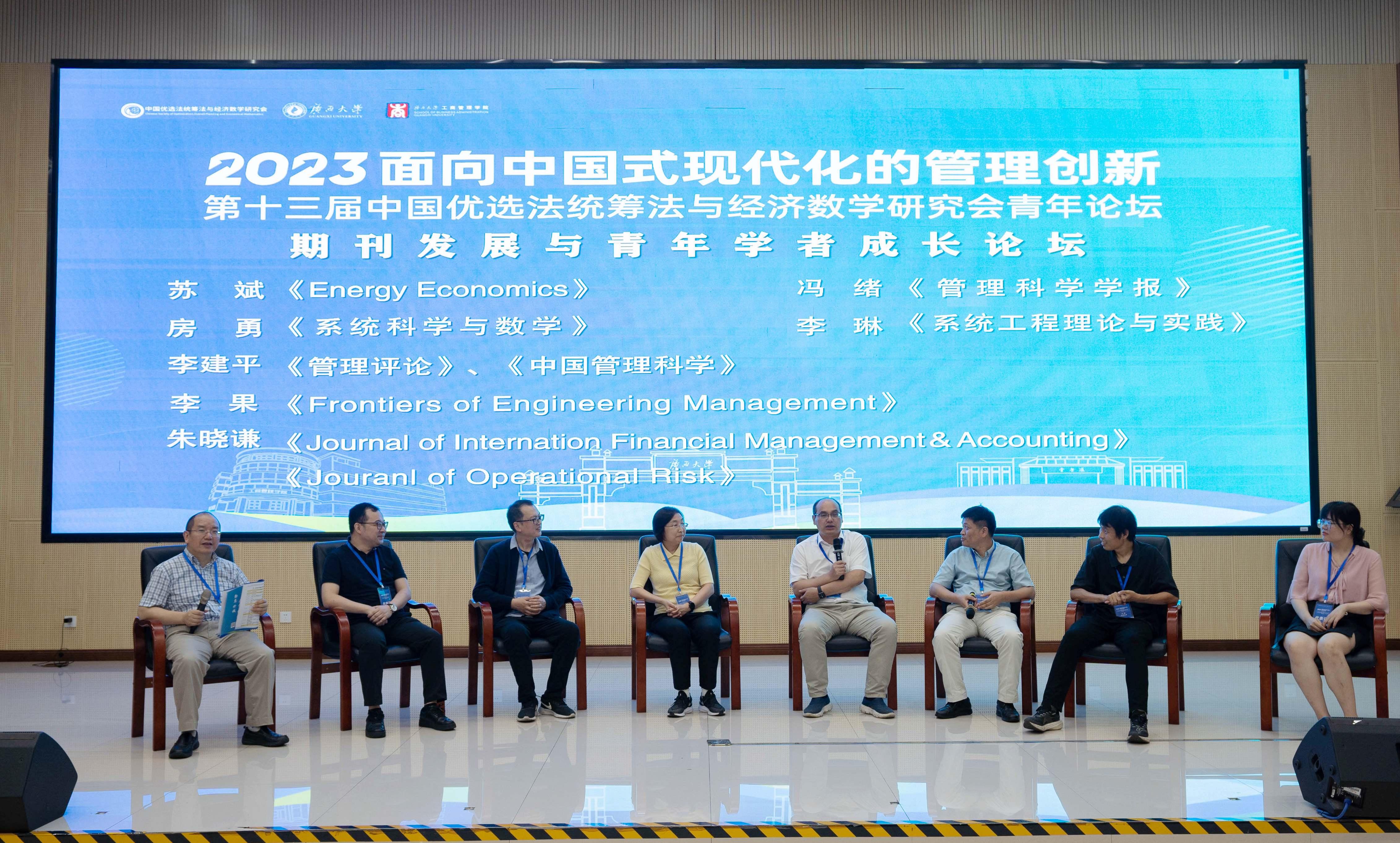 在期刊发展与青年学者成长论坛环节,在四川大学余乐安教授的主持下,北京理工大学张斌教授、华南理工大学牛保庄教授、北京大学戴瀚程副教授、南开大学李辉教授就海归学者与本土学者面临的机遇和挑战、青年学者如何做好科研工作、做好时间统筹管理、找准核心竞争力,如何更好地将科研与教学相融合、更好的服务社会等青年学者关心的热点问题进行了一一解答,并结合自身经历分享了相关经验,提出了建议。