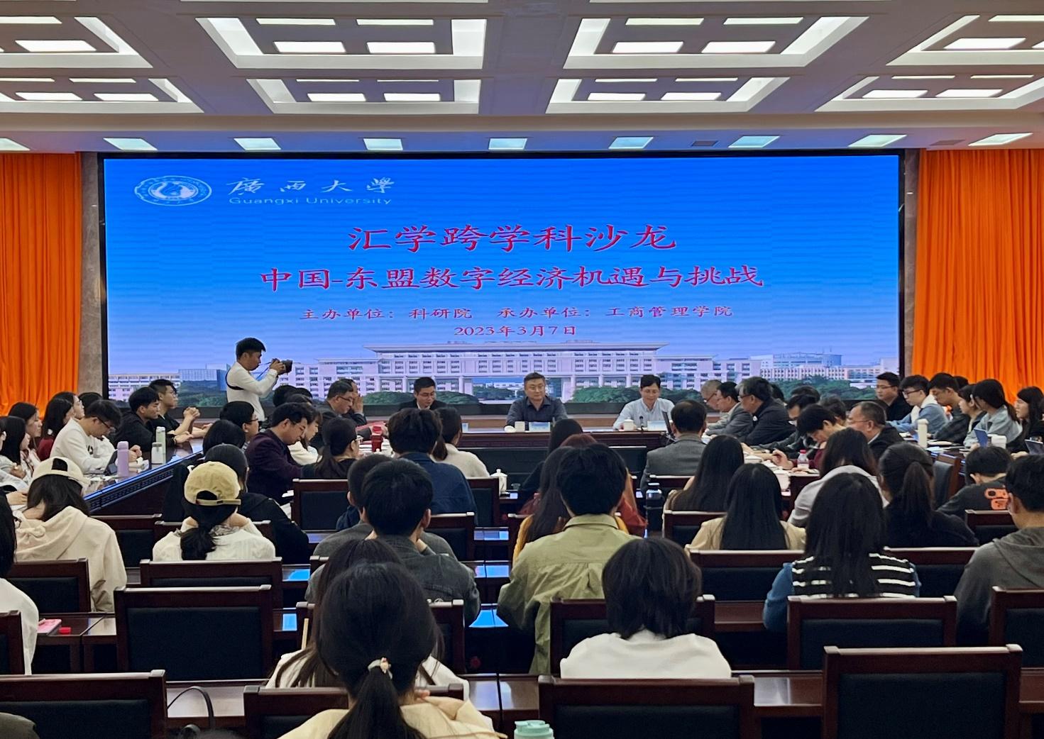 活动现场,覃朝勇副教授、唐红祥教授、何诚颖教授、蒋侃教授、覃志敏副教授、董笃笃副教授分别围绕“中国-东盟数字经济机遇与挑战”的主题,从中国数字经济发展面临的机遇和挑战、建设中国-东盟数字交易中心、广西构建面向东盟数字经济合作所提供的价值、中国-东盟数字经济合作机会、数字经济与农业发展如何紧密结合、如何继续深化和创新数据经济的法律支撑等方面进行了主题发言。嘉宾史云贵教授、许光耀教授等就数字经济治理体系的完善、发展,以及如何测评等进行了探讨交流。沙龙现场,跨学科观点碰撞出思维火花,气氛热烈、氛围浓厚,带给师生一场深度交流、智慧共享的知识盛宴。