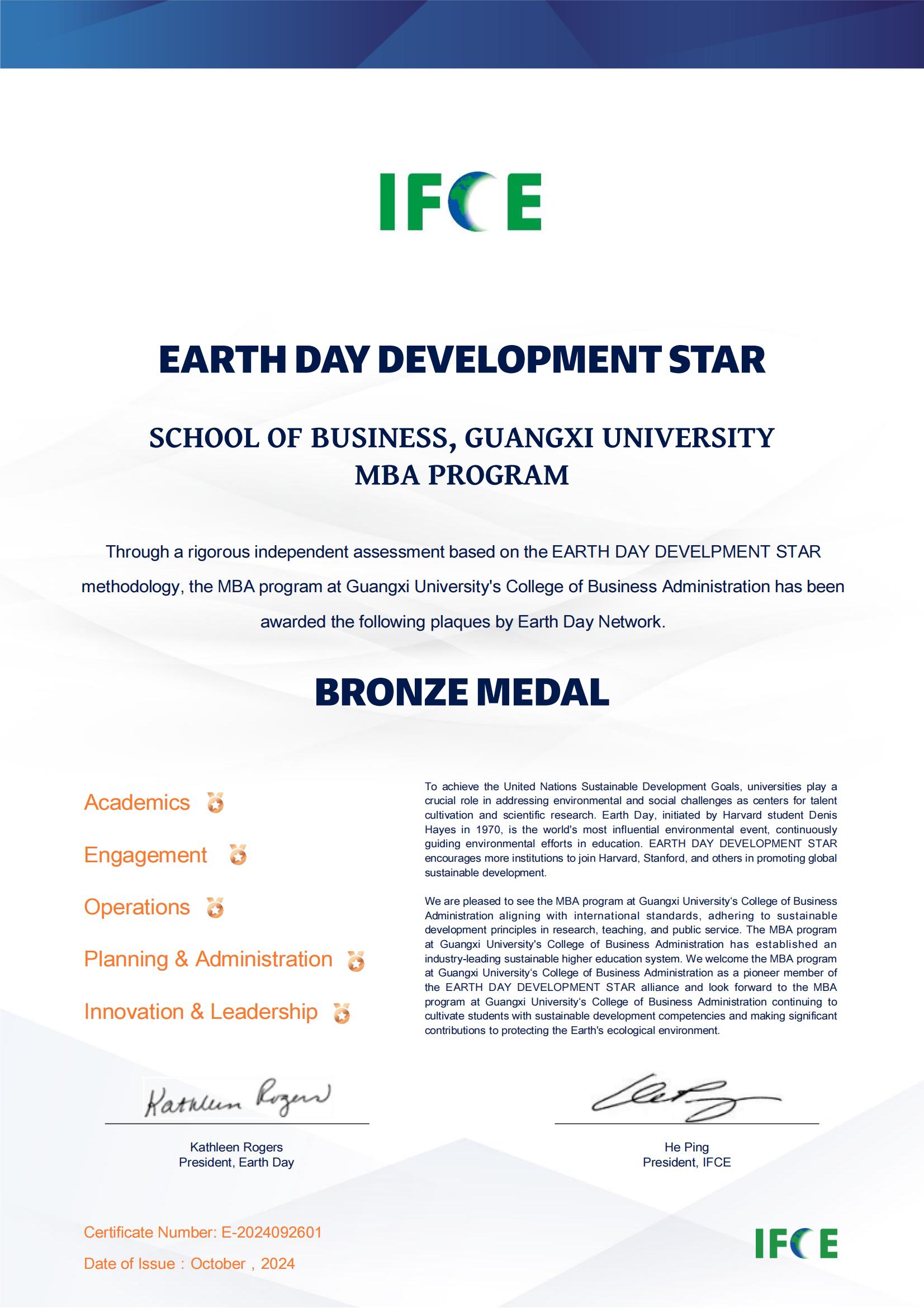 MBA项目获得EARTH DAY DEVELOPMENT STAR铜牌认证,表明该项目在ESG和可持续发展领域得到了国际认可。